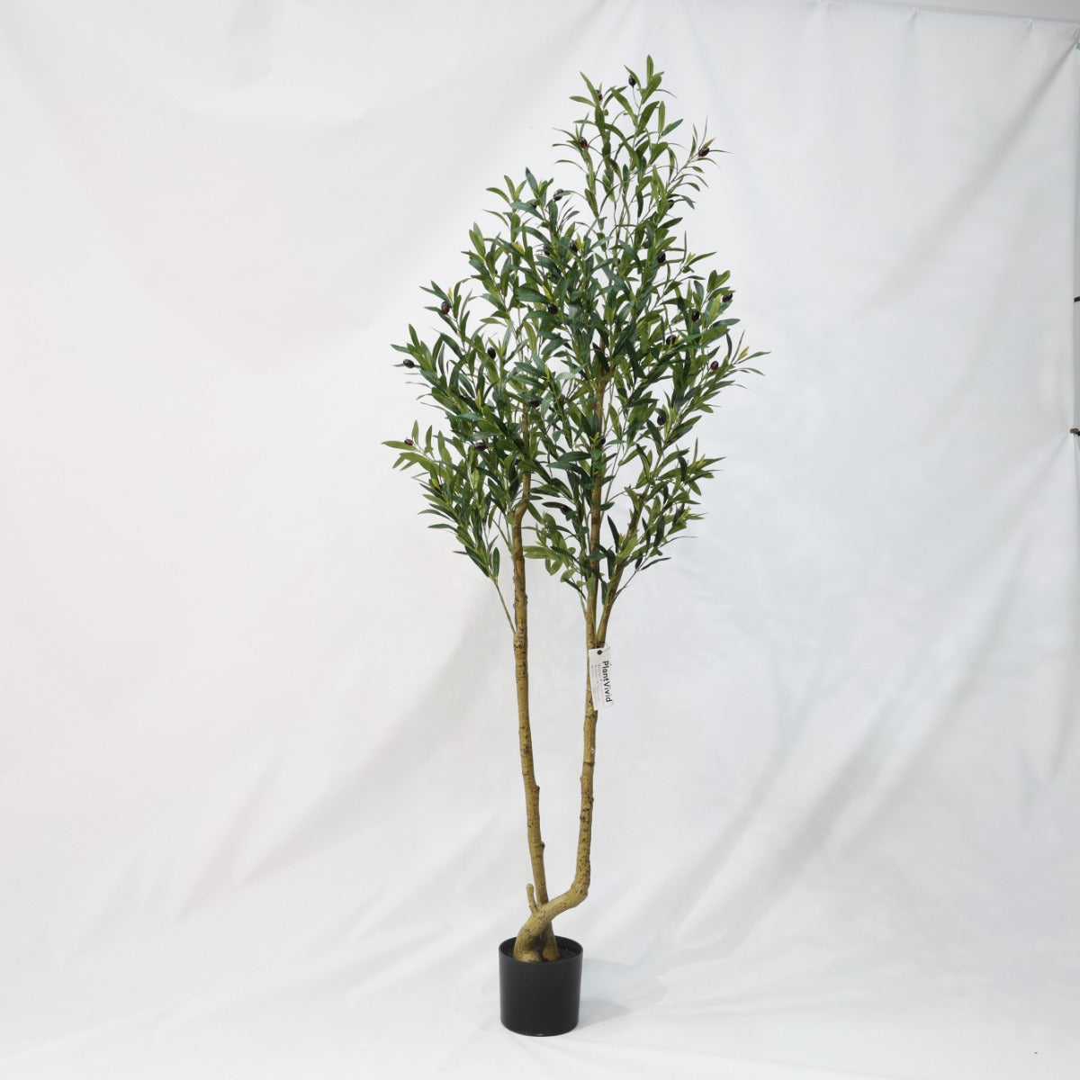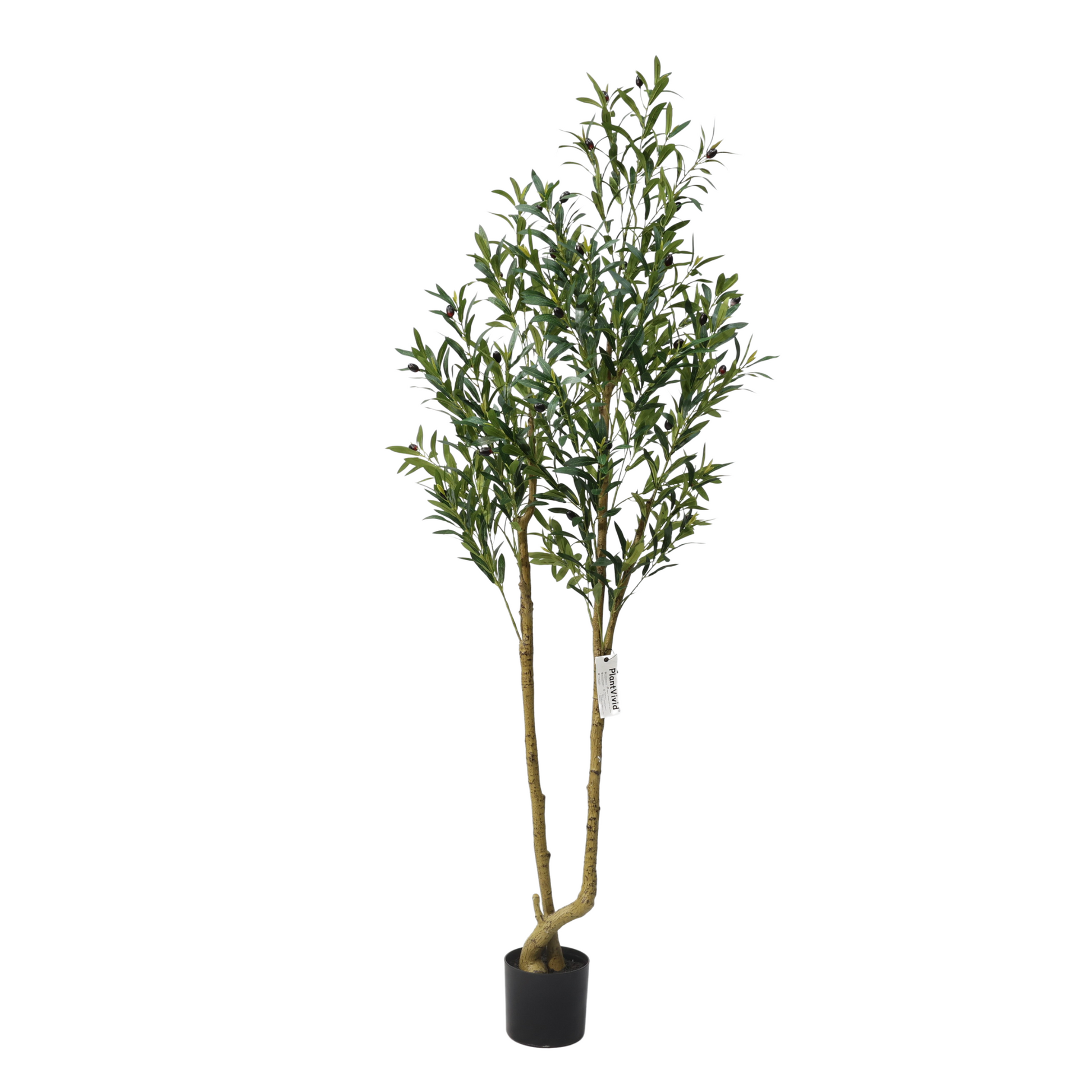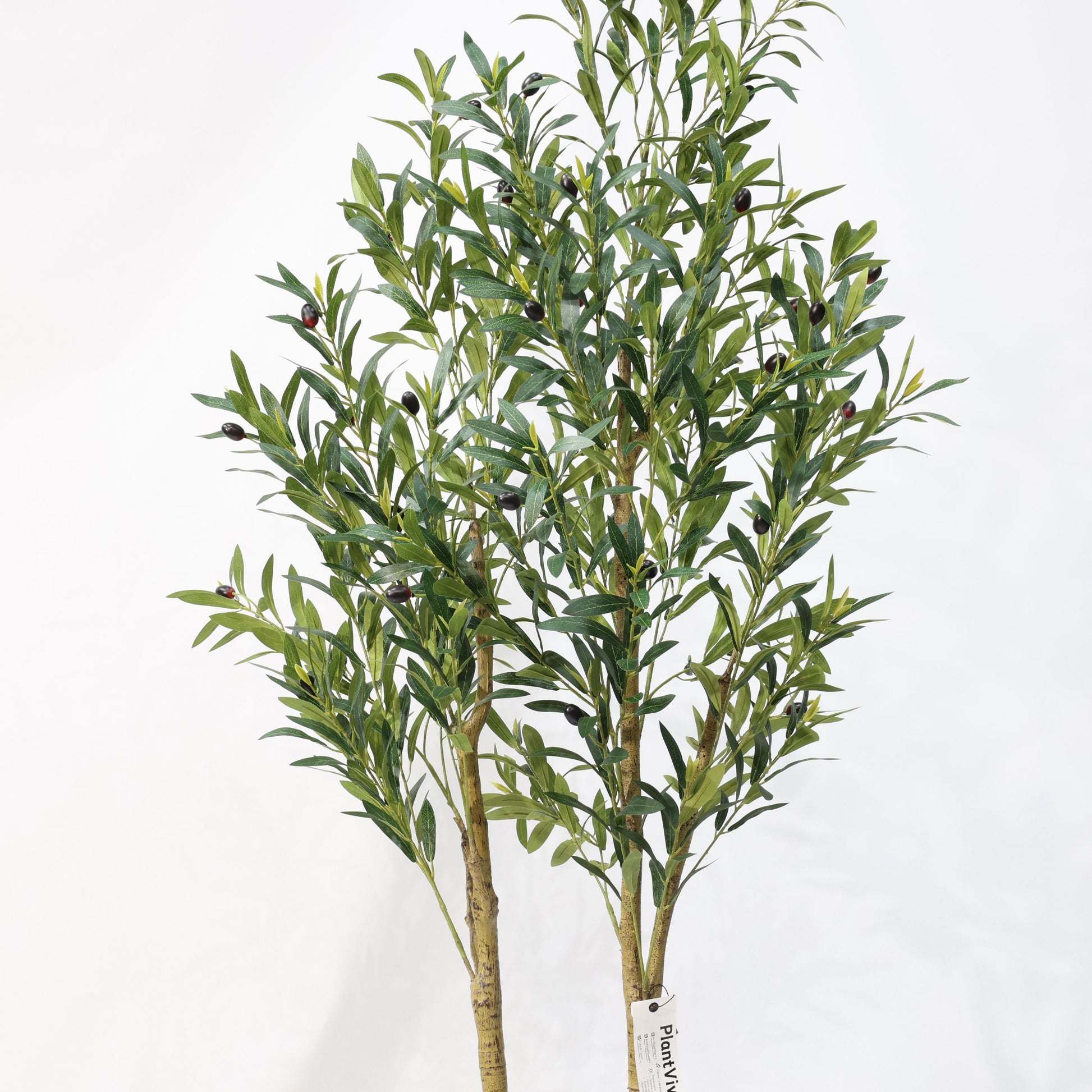 · Dual-Head Realism: Two naturally curved trunks with dense olive clusters mimic mature tree growth patterns