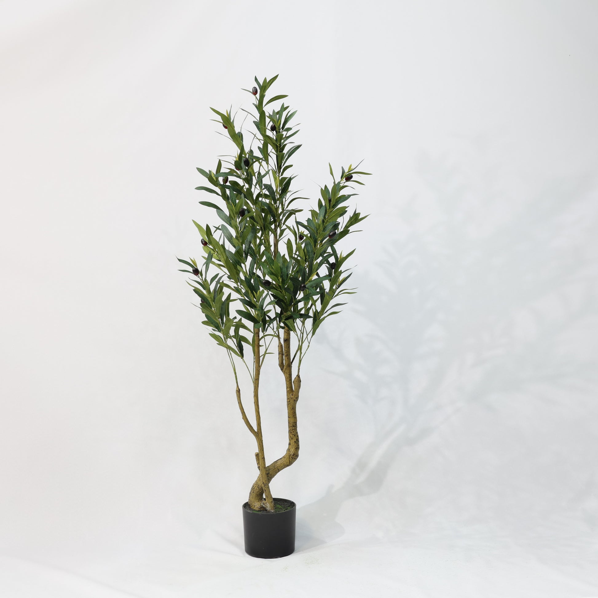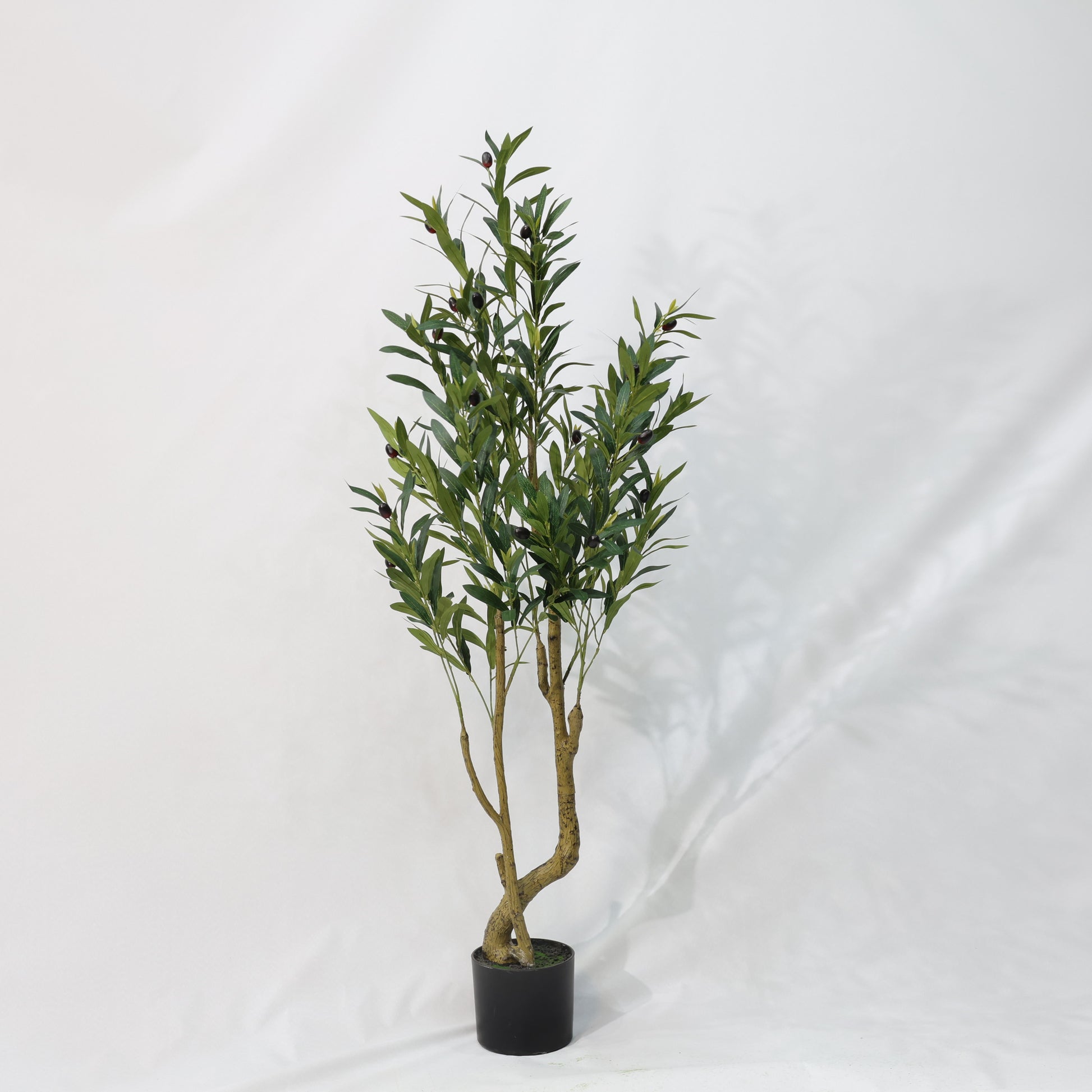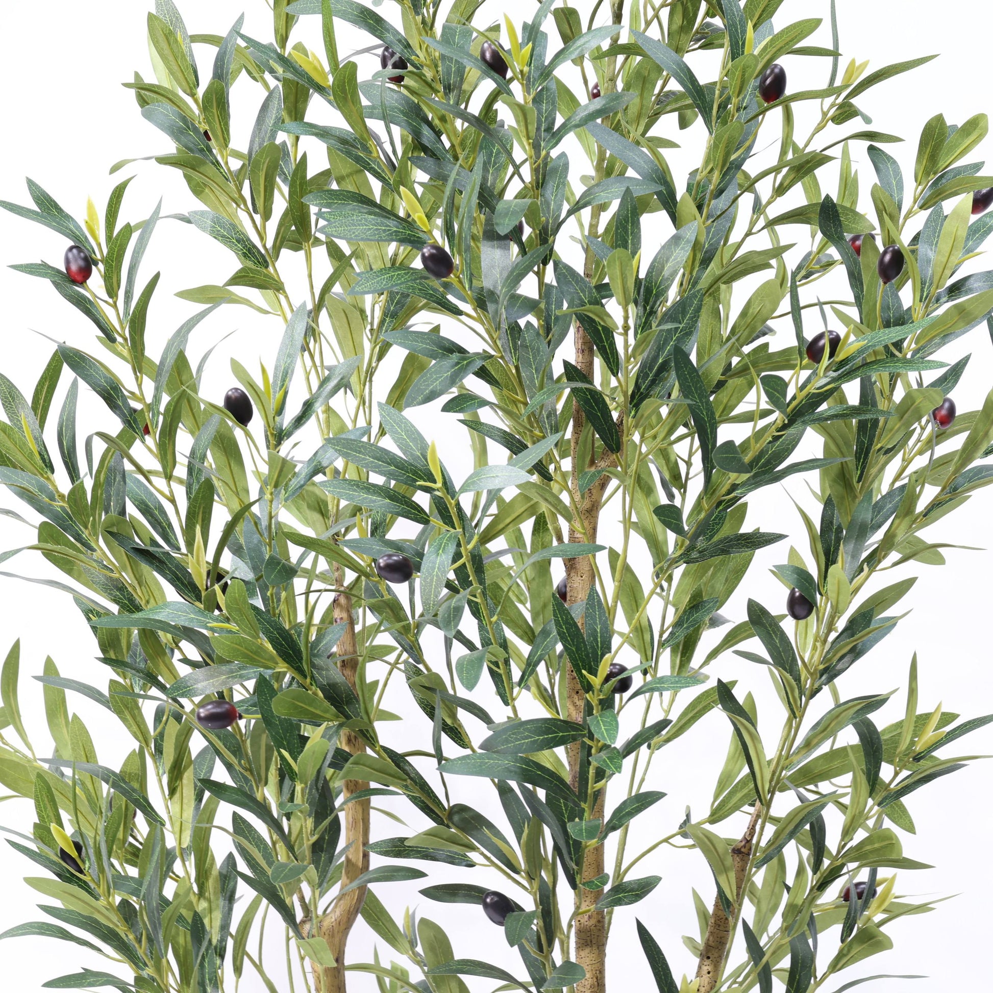 · Dual-Head Realism: Two naturally curved trunks with dense olive clusters mimic mature tree growth patterns