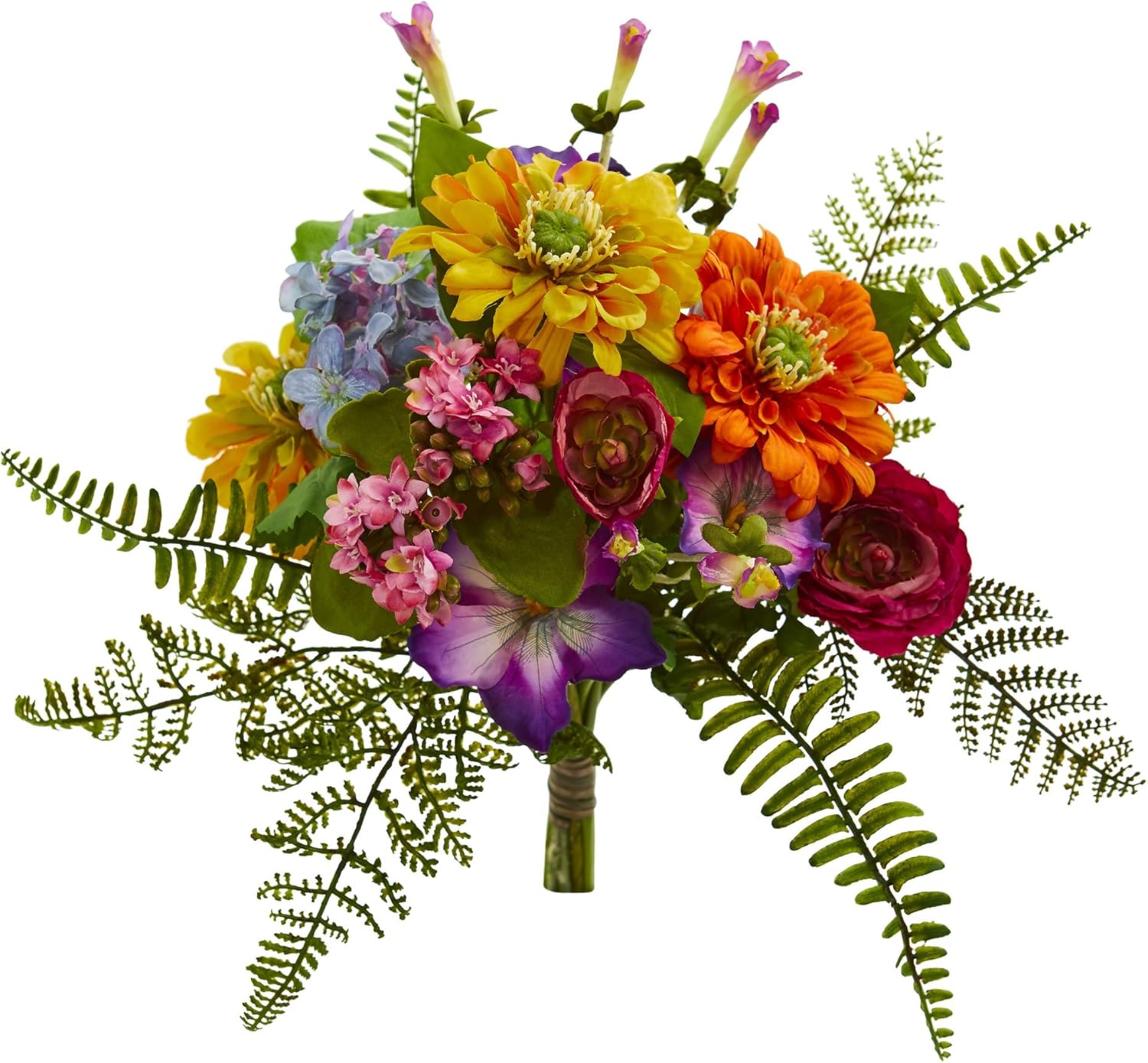 The mixed flowers artificial bush has a beautiful display of bright orange, deep purple, and yellow blossoms, and green foliage. With the variations in flower size and color and the display of different kinds of leaves, this set of two will take the guess work out of putting together a beautiful arrangement. Settle them together in a clear vase in your bookshelf next to a stack of antique books and other potted faux plants for a lovely indoor garden display.