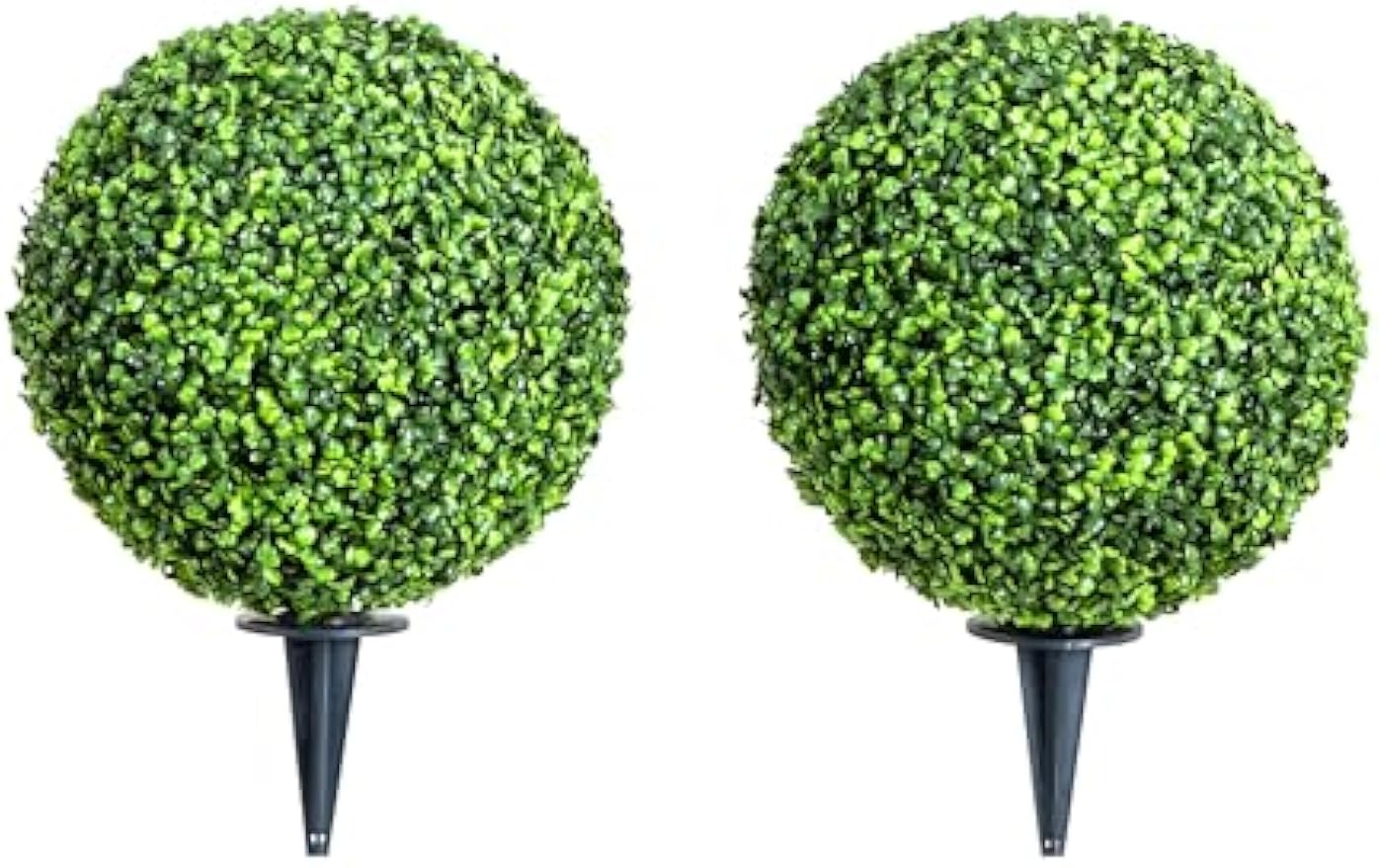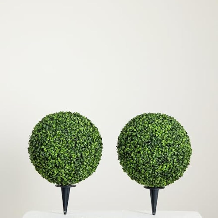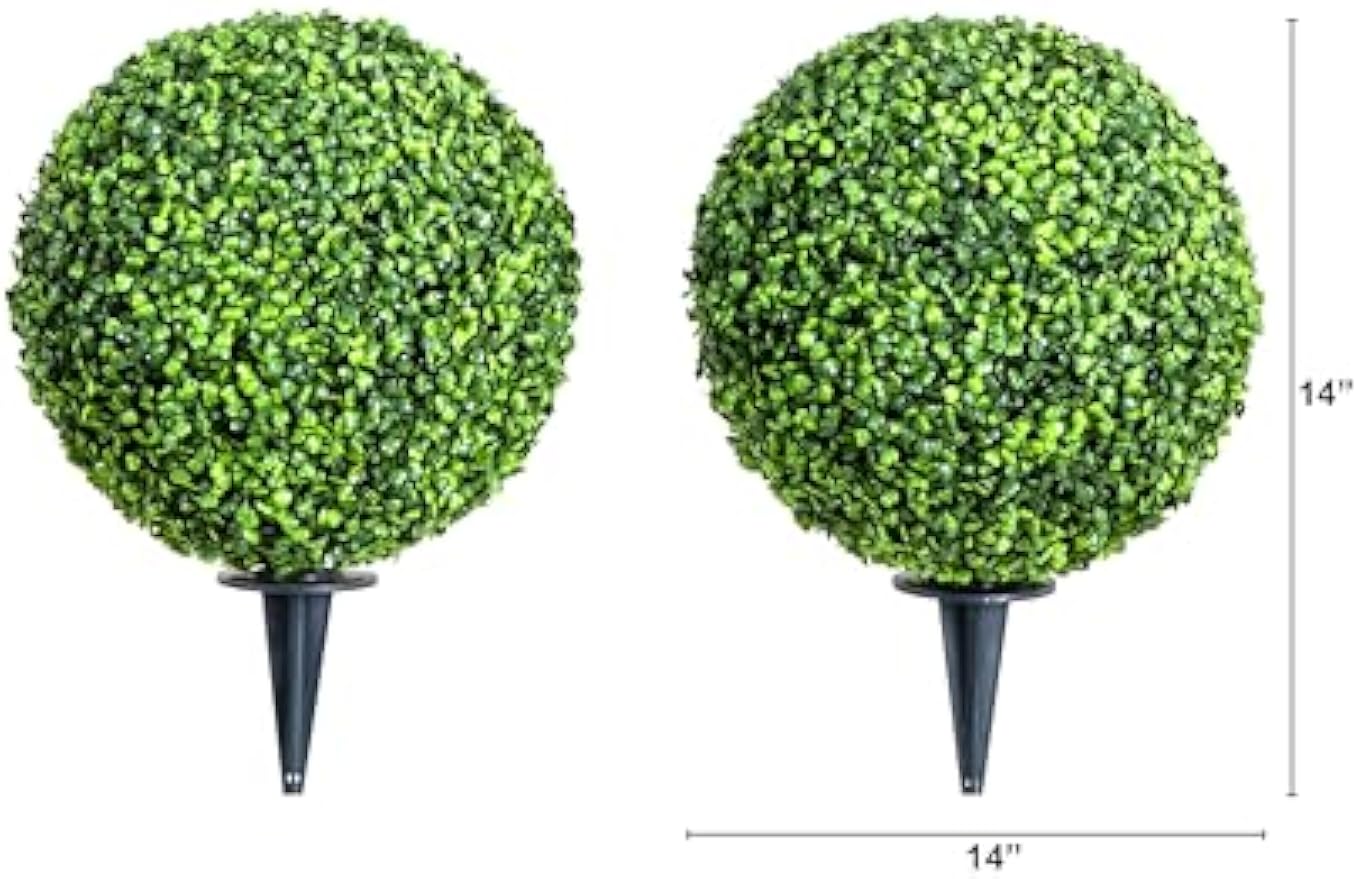 14-in Artificial Boxwood Topiary Ball for Outdoor Use with Integrated Ground Stake, Set of 2 Faux Boxwood Plants for Lawn & Garden, Bac