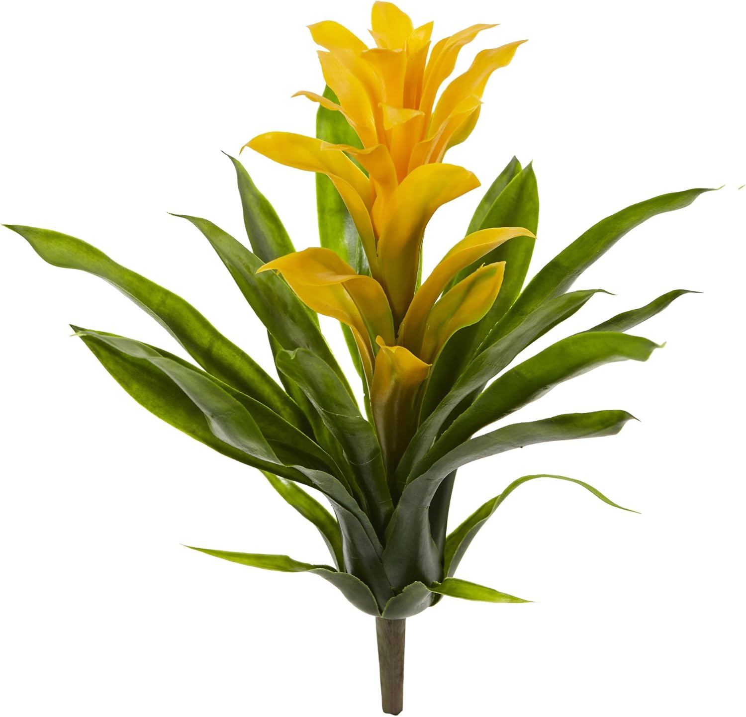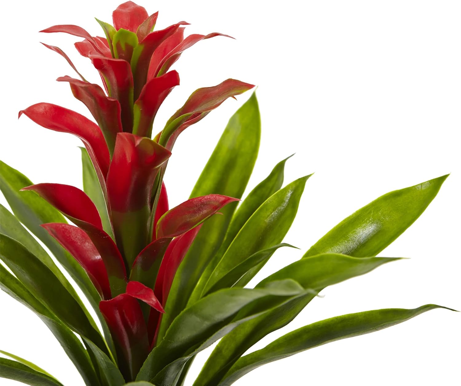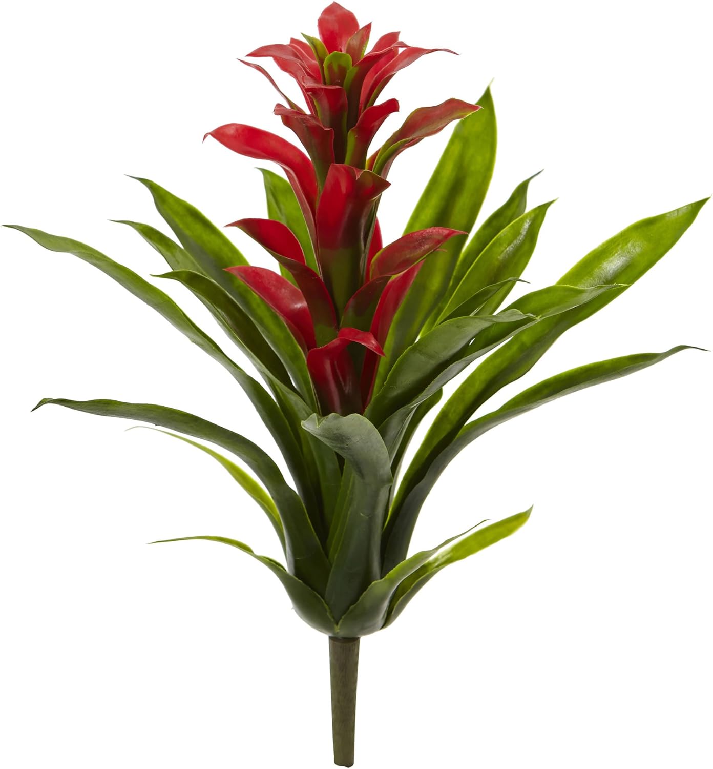 Curving outward elegantly, the green leaves of this 15-inch artificial bromeliad flower open up to reveal brilliant blooms that rise above the foliage. Coming in a set of four, these ornaments can be bundled together in a clear vase to create a full, lush look in your bedroom. Use it as a centerpiece for a dresser with a picture frame or decorative lamp placed beside it for a complete arrangement.