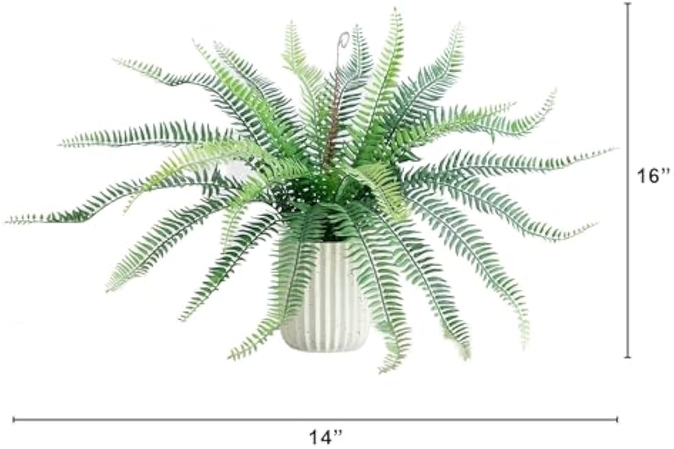 16-Inch Artificial Boston Fern Plant – Lifelike Greenery in Textured Cement Planter
