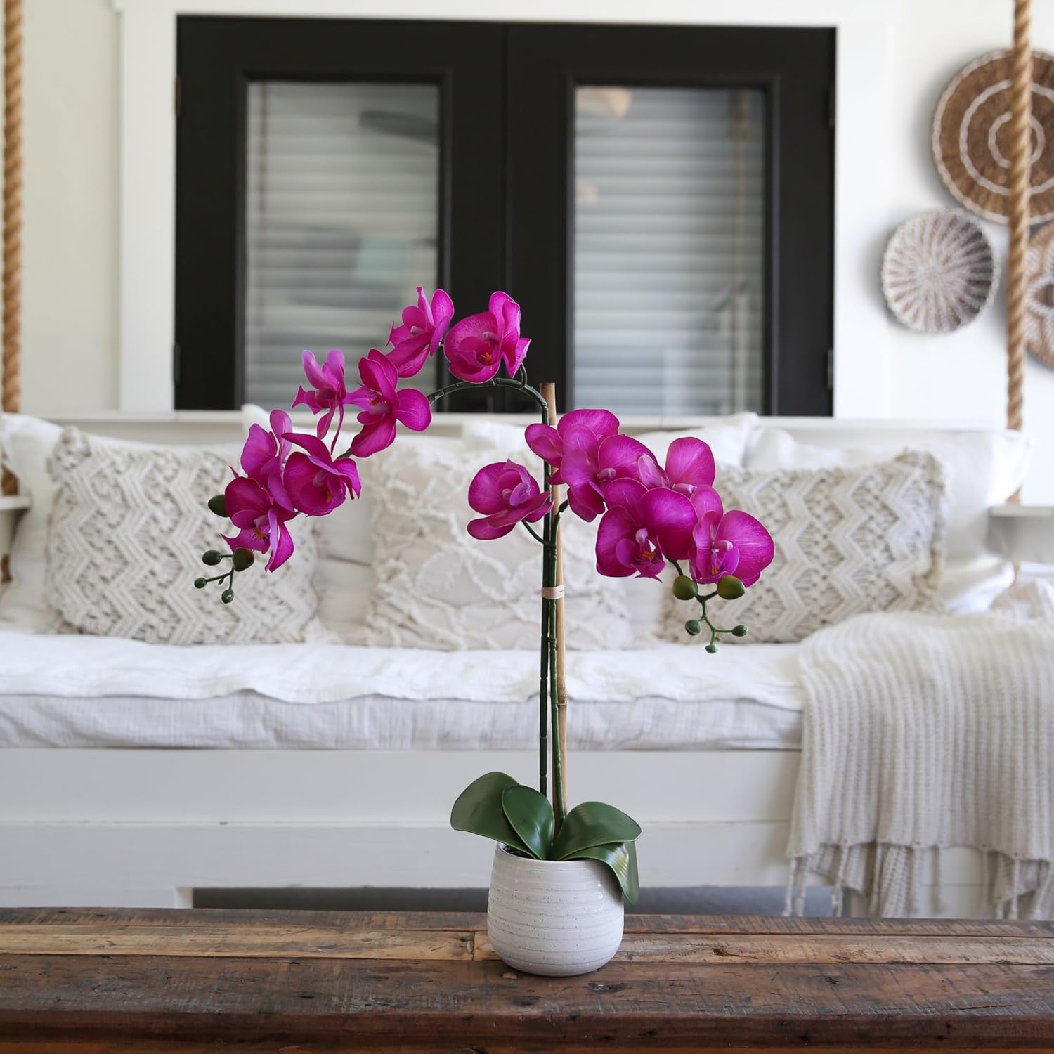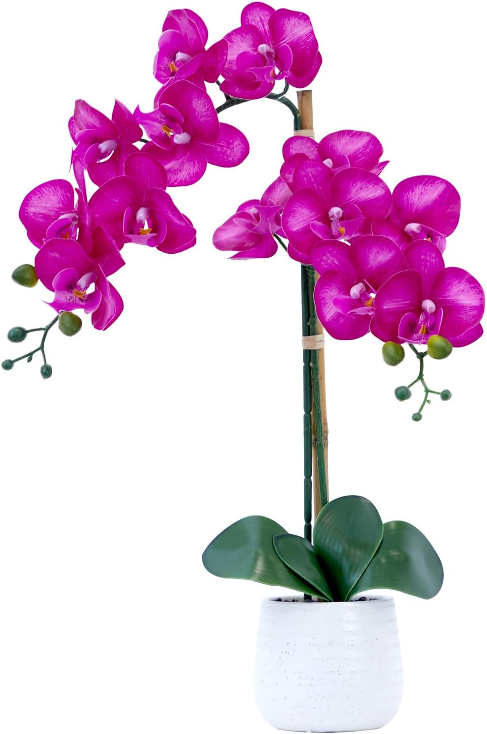 Do you crave a fresh-from-the-garden look all year round? Then you need our stunning silk orchid arrangement. Inspired by nature, the petals feature intricate details that mimic the real thing. Each pattern has been carefully crafted by skilled horticulturists. Made from high-quality materials, the branches can be easily bent to fit any space. The vibrant purple color beautifully contrasts with the large, green leaves, adding a touch of drama to your decor. Housed in a white textured decorative vase with moss, it will instantly liven up any space. Perfect for a living room, kitchen, or desktop.