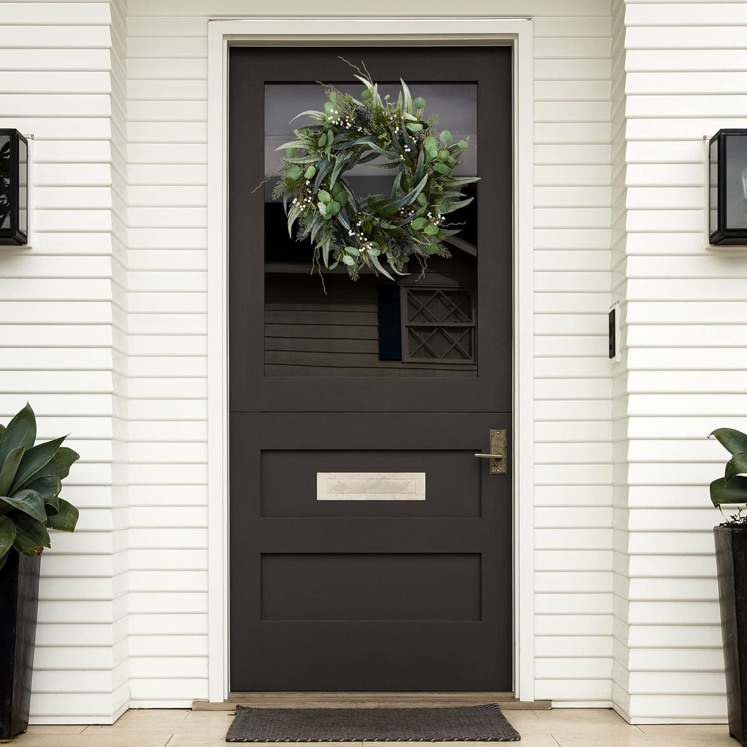 A combination of several lush green leaves, dotted with dainty white berries, makes up this artificial eucalyptus wreath. With its luxurious greenery, this versatile piece will look perfect in any settings, no matter what time of year it is. You can hang it in your living room or on a bedroom door and complement it with your personalized door sign. Artificial plants offer a convenient and low-maintenance way to bring the beauty of nature into your home or office. With their lifelike appearance, these plants provide all the benefits of real plants without the need for watering, sunlight, or pruning.
