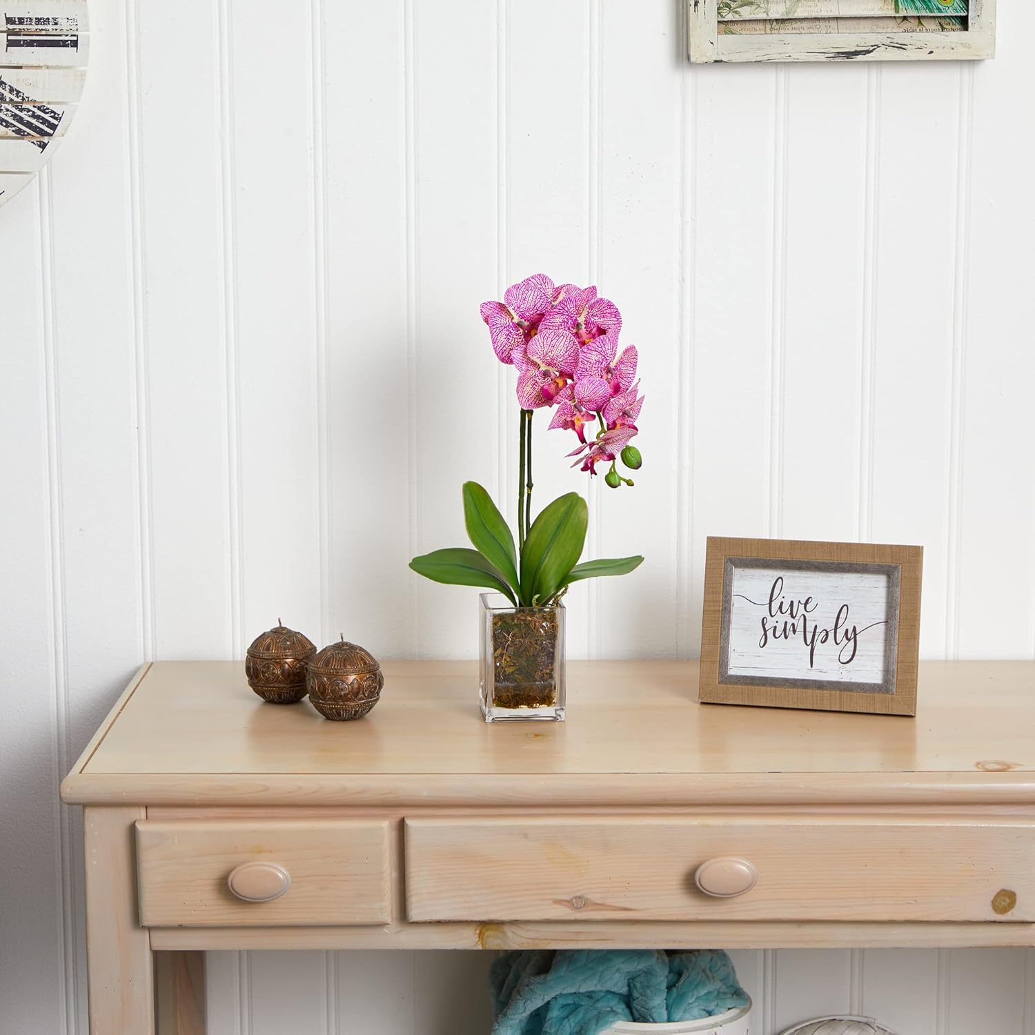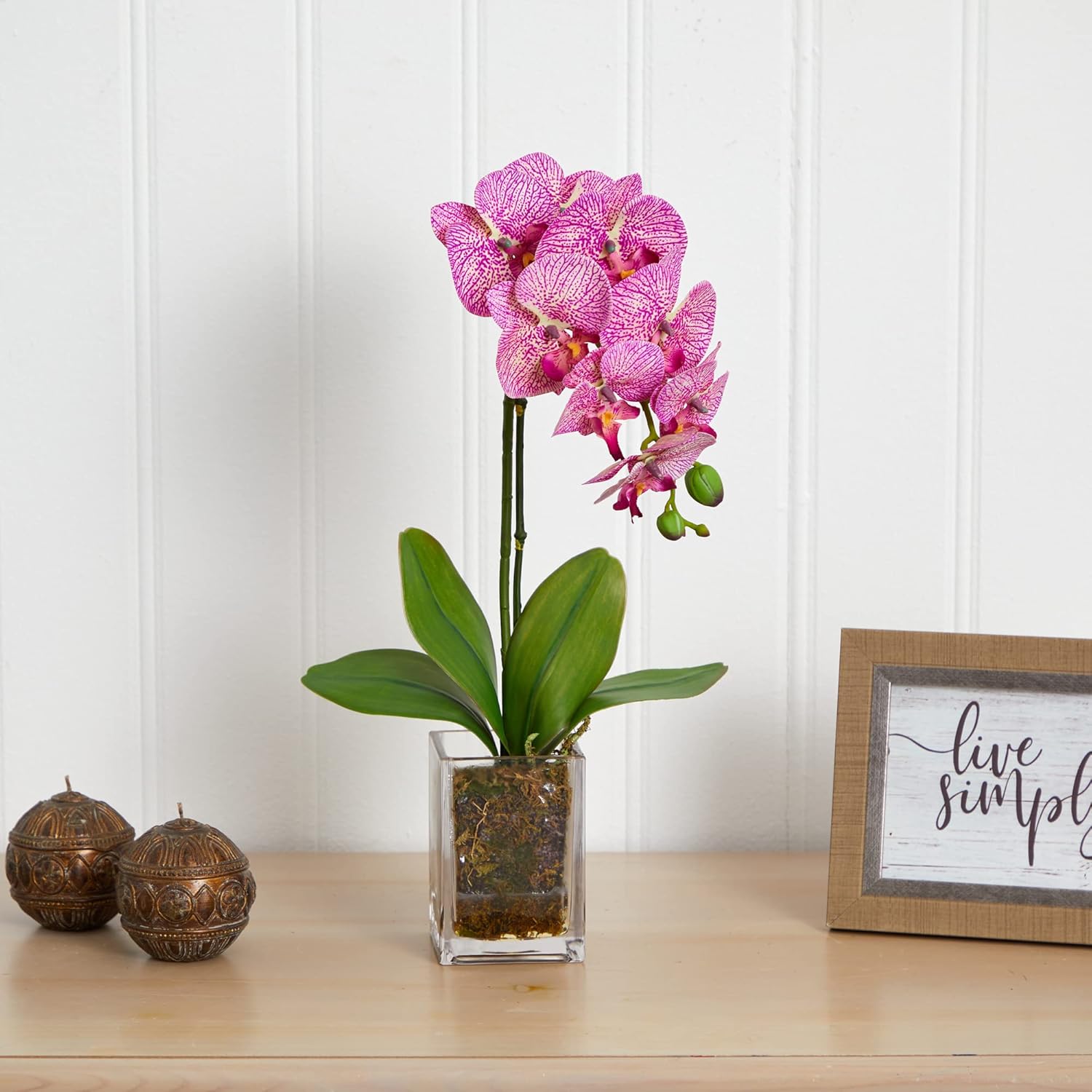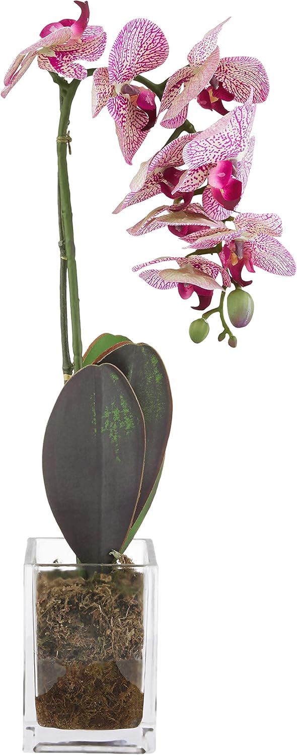 Settled with in a clear vase, the 24-inch artificial orchid phalaenopsis arrangement features soft flowers and realistic foliage that sits at the base of the stem. Simplistic and elegant in design, this décor piece will brighten up and add a splash of color when positioned on a kitchen counter next to your coffee maker or a bathroom counter near the mirror.