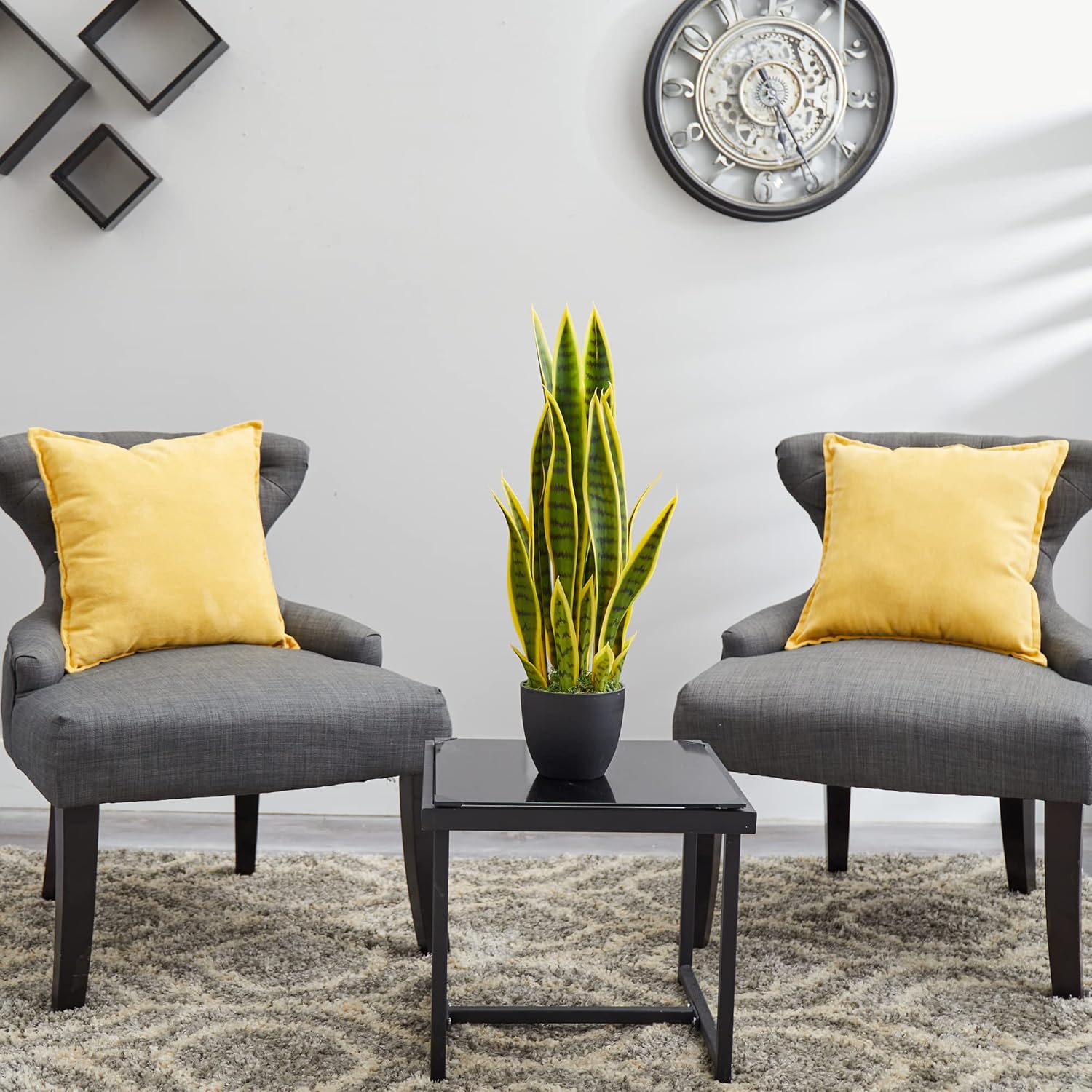Bring a unique and bright look to your home with this artificial sansevieria plant. The flat Green leaves are striped and have a ring of yellow lining the outside, making this a great statement piece. Standing at just 26", it's the perfect size to accent nearly any space! place it on your kitchen island next to your favorite bowl of faux or real fruit and a few of your favorite small faux succulent for a fun and fresh finish.