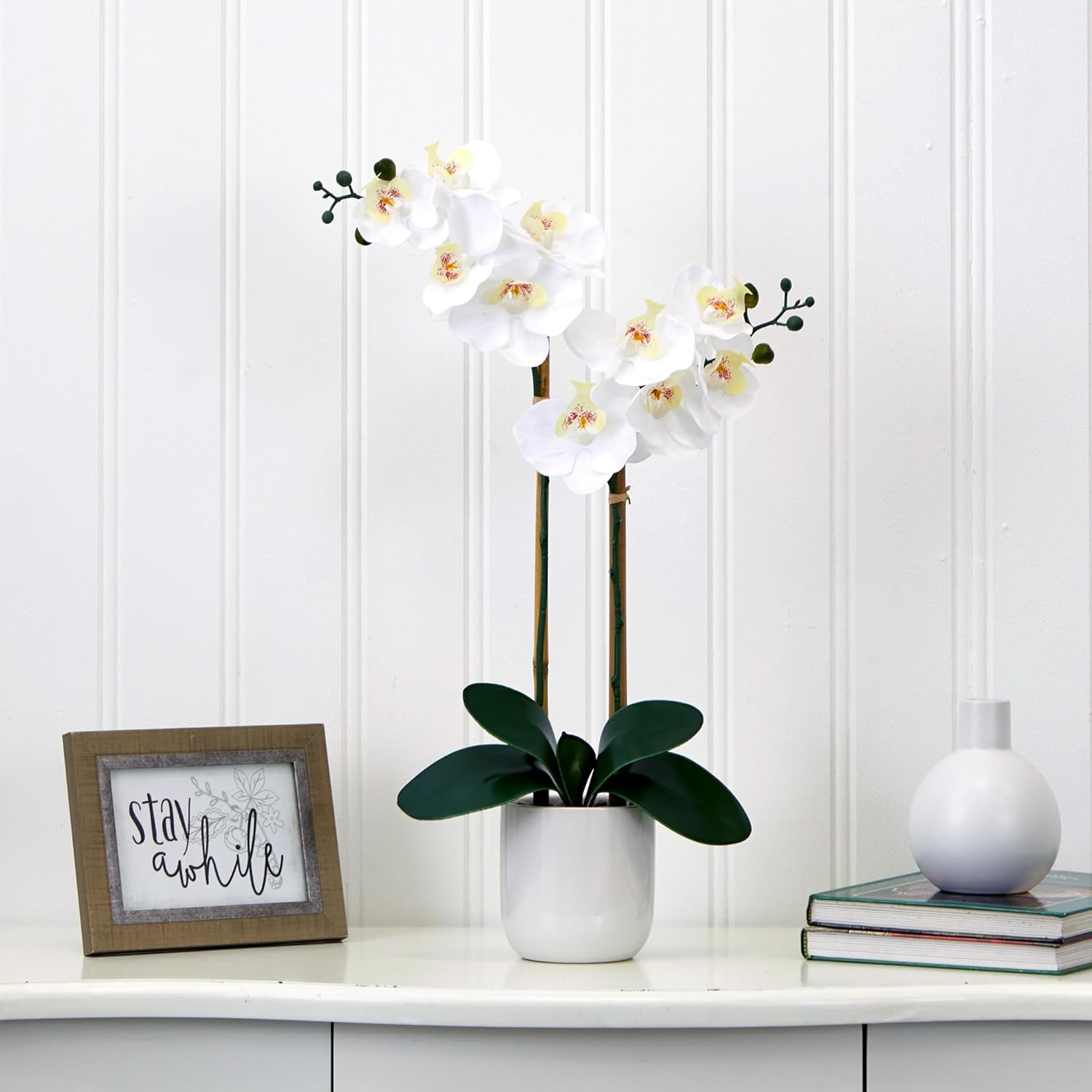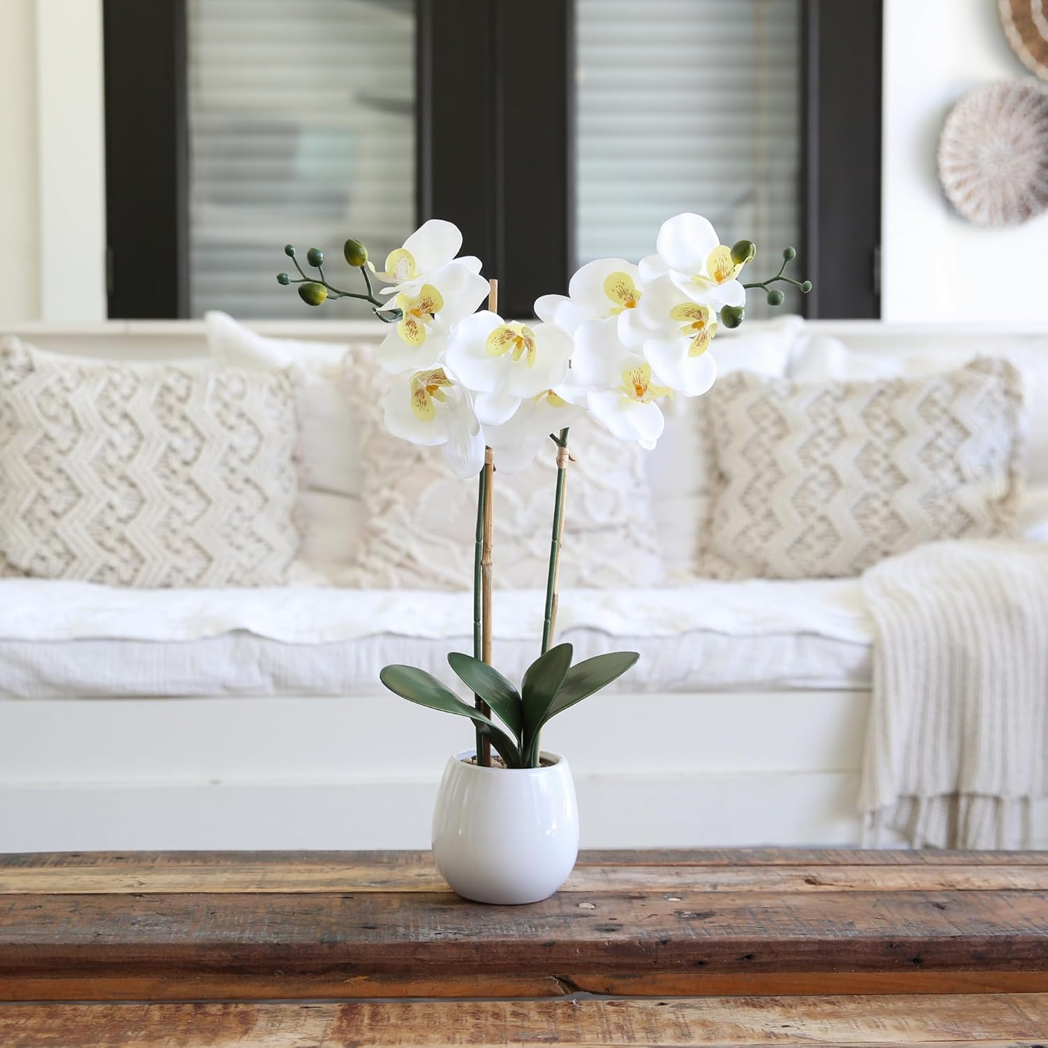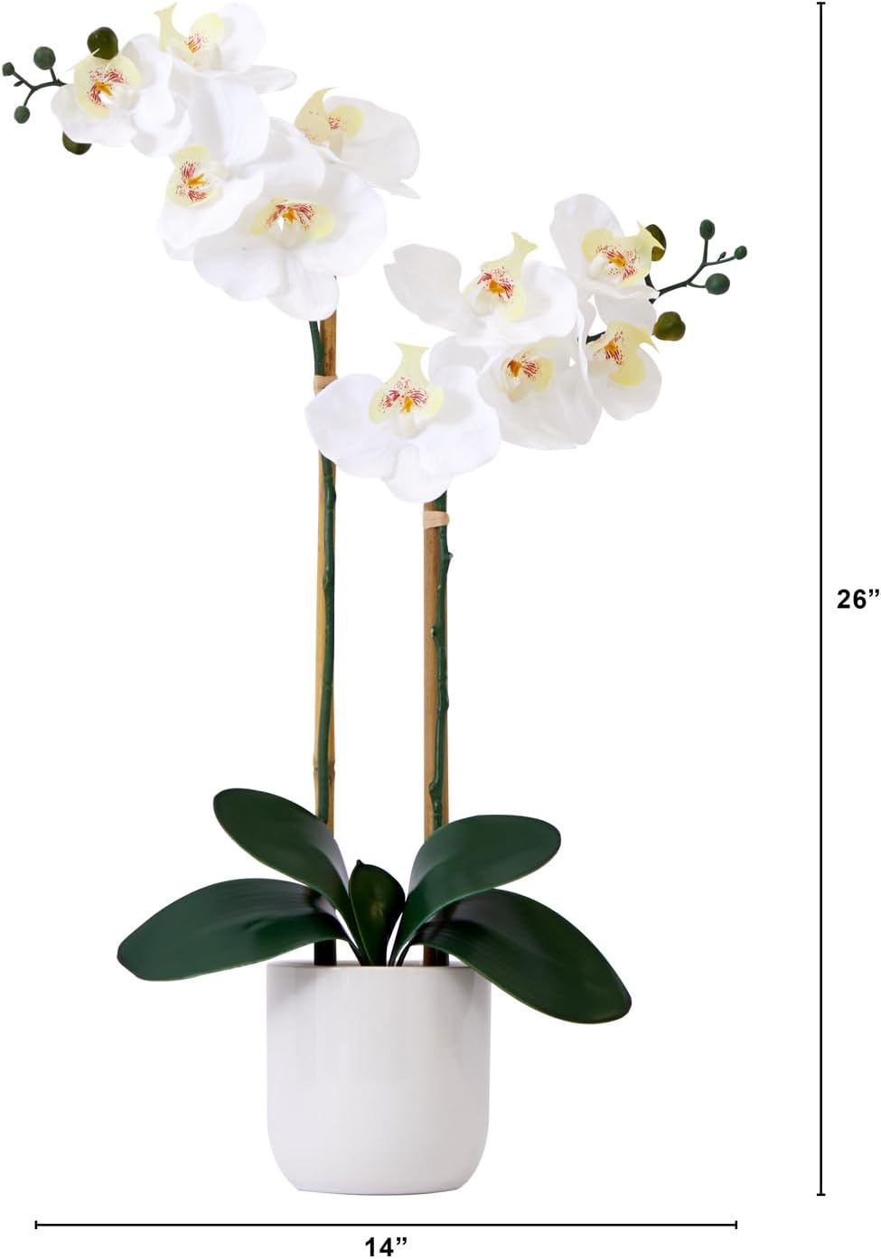 Immerse yourself in the natural beauty brought by our incredibly lifelike silk orchids. These exquisite flowers are among the most realistic pieces in our exclusive collection. With lifelike petals that feel real to touch, you'll be amazed by their authenticity. It's hard to believe they're not real! Our horticulturists have crafted them using high-quality materials and a specialized manufacturing technique, allowing you to even bend the branches for your desired arrangement. Enhanced by vibrant green leaves, the two white stems create a sense of drama and contrast. Standing at a height of 26" and elegantly showcased in a white vase with faux moss, these captivating pieces will breathe life into any area that yearns for natural beauty.