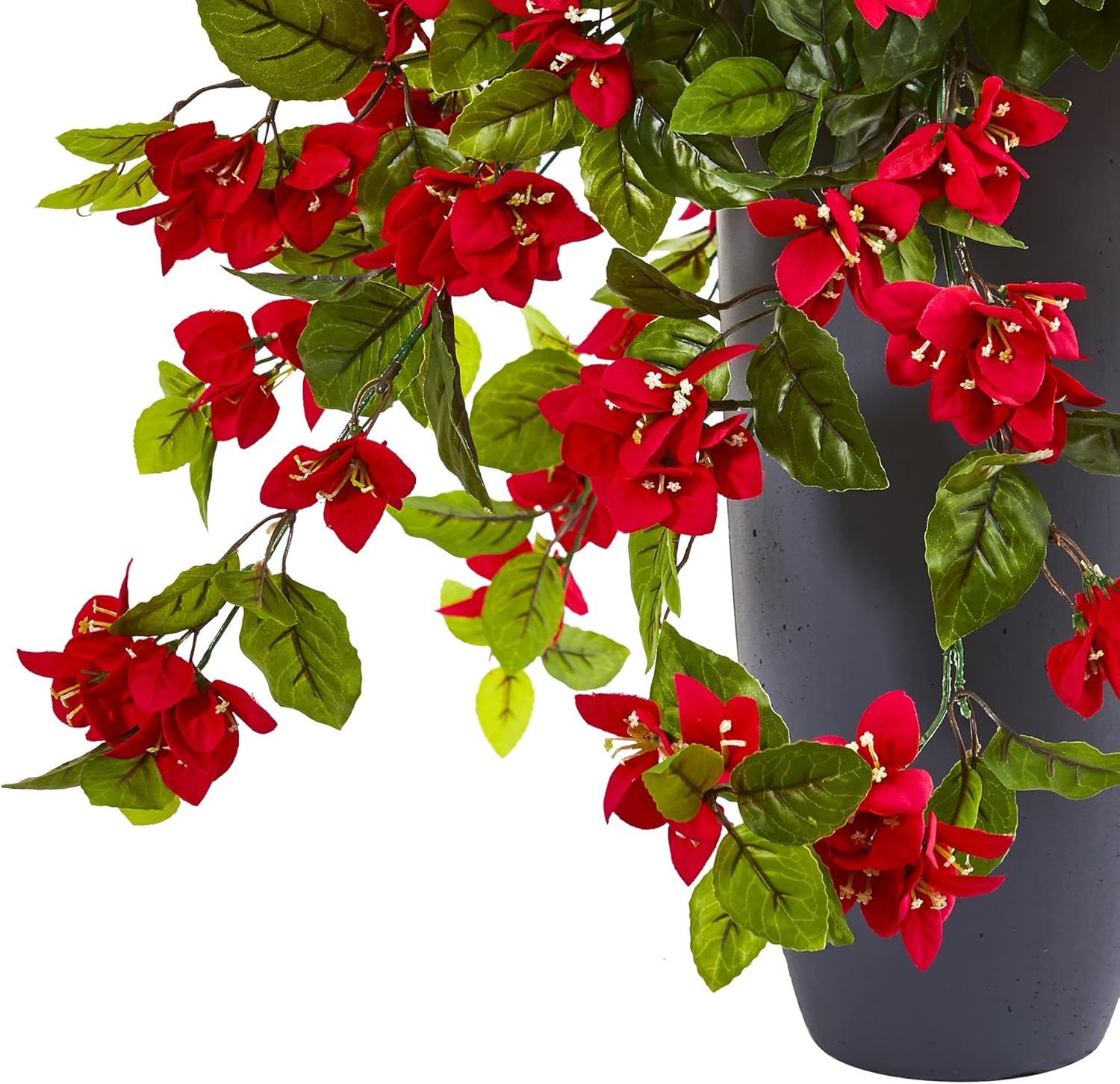 Transform bare spaces with this artificial bougainvillea. Standing 26” high from its accompanying planter, this lush plant boasts vivid little blooms contrasted with realistic, green foliage - all UV resistant. Bright and beautiful, it would make for an inviting accent inside or outside near a home or office entrance with out fear of damage from the natural elements.