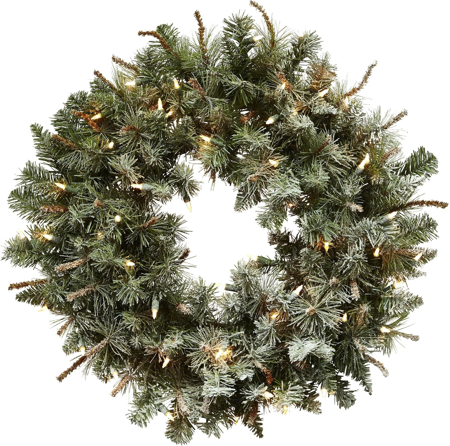 Guaranteed to make you think of cool, crisp winter evenings, this wonderful wreath is perfect for holiday decorating. With fluffy pine tips (170 of them) frosted just so, it'll look like a delightful little snowfall happened in your living room or office. The cherry on top is the 50 clear lights, which make it look nothing less than magical. Makes a fine gift as well.