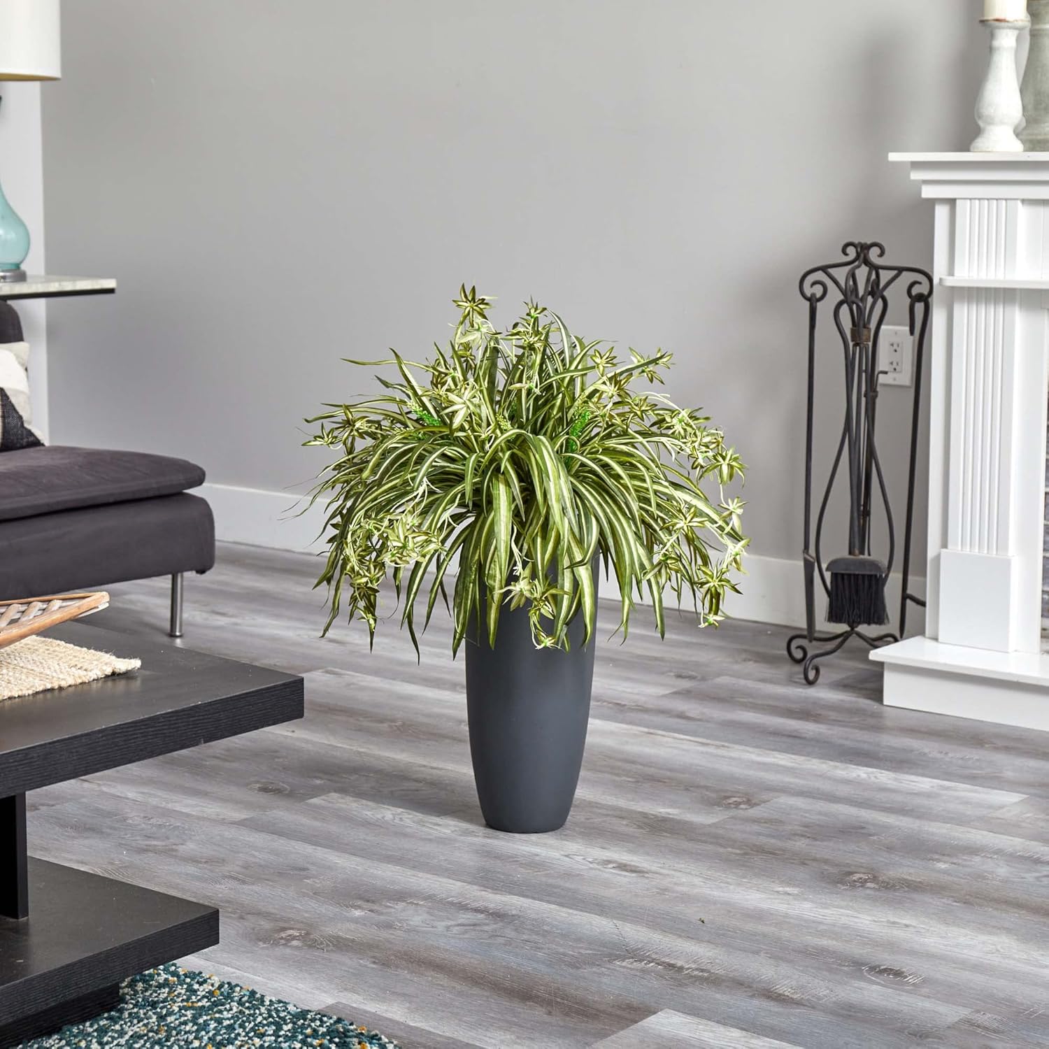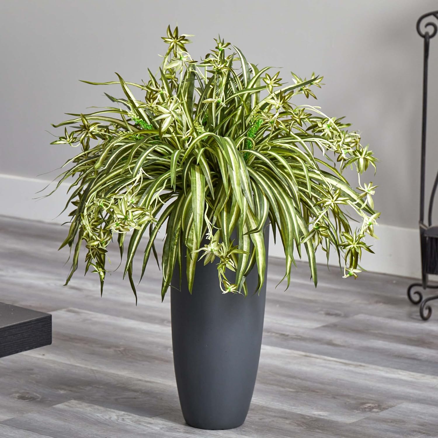 With green and yellow spears of foliage creeping out of the included cylindrical vase, this artificial spider plant is a perfect addition to almost any office and living space. Attractive and relatively compact in its slim container, put this spider plant by an end table or desk with smaller artificial flowering plants.