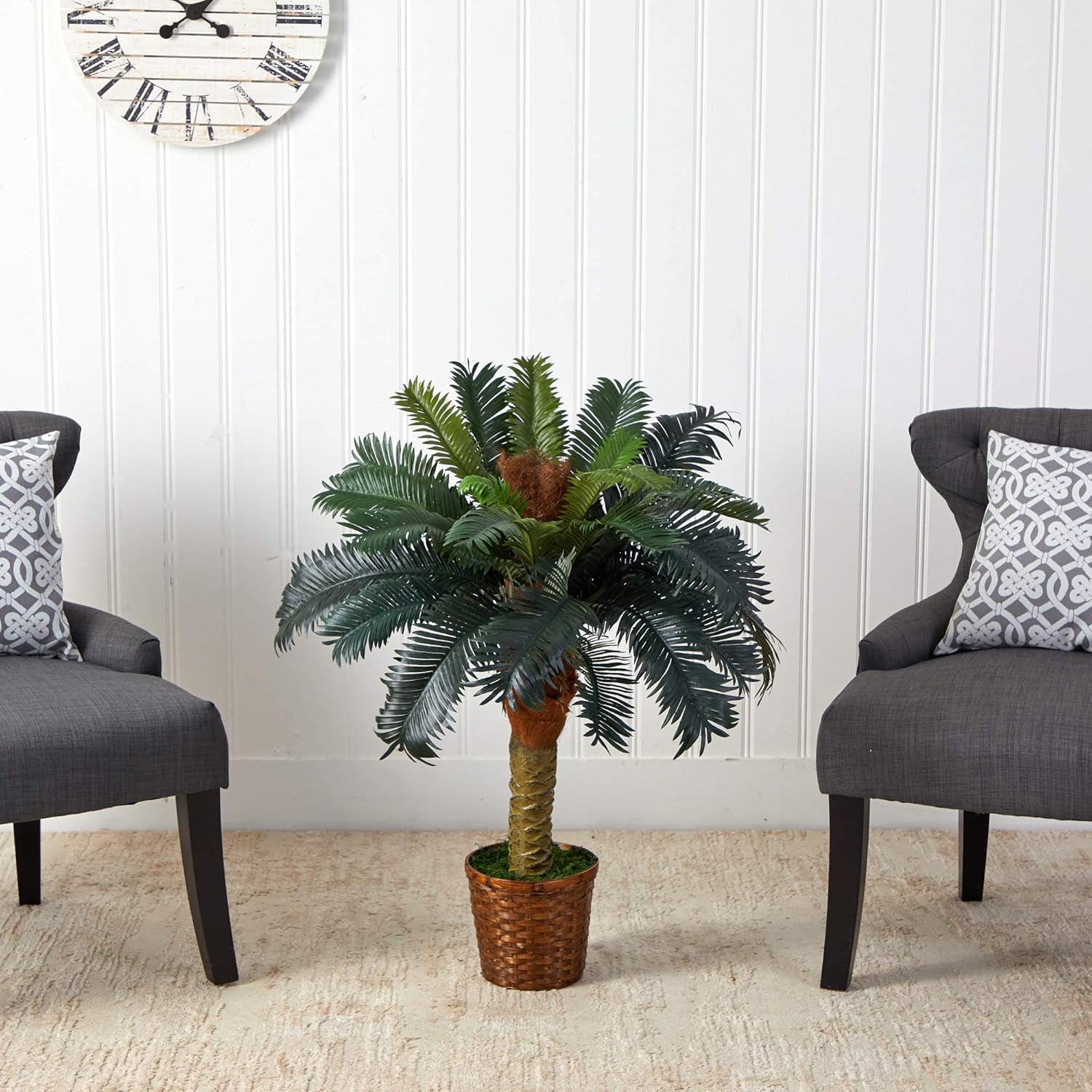 Native to tropical regions, you can now enjoy the calmness that this Sago Palm artificial tree instills. Long, palm fronds stem from a thick brown trunk with realistic looking detail, that are inspired by nature. Escape to a tropical paradise from the comfort of your own home. Standing 3' from a planter with faux moss, curate in any compact space that needs a vacation. Perfect for a lonely corner, next to a table, bathroom or bedroom.Silk trees are manufactured using synthetic materials, such as polyester material or plastic, and are well designed and constructed to be life-like in appearance. This item will need to be re-shaped when removed from the secure box to allow it to reach its fullest size. Your artificial plant will look beautiful for years to come; simply wipe clean with a soft dry cloth when needed.