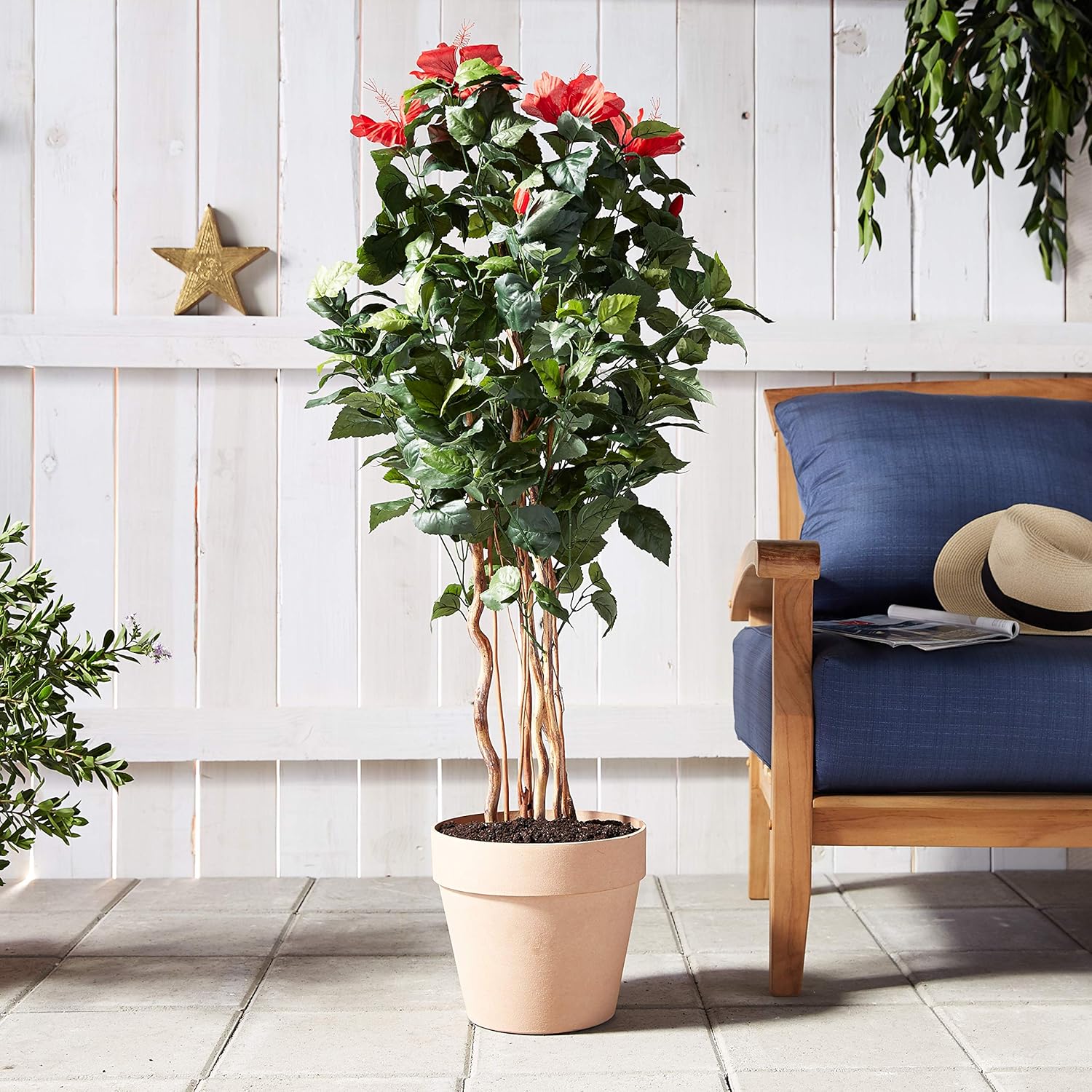 The hibiscus tree is one of our favorite flowering trees. Because in full bloom, the mixture of colors and textures is unlike any other tree. This perfect recreation captures a 4' tall Hibiscus tree in bloom, with unique "gnarly" trunks twisting upwards, an explosion of lush greenery, and pretty hibiscus flowers. It's an ideal home or office decoration, and as a bonus, will stay looking perfect with nary a drop of water. Makes a thoughtful gift as well. Silk arrangements are manufactured using synthetic materials, such as polyester material or plastic, and are well designed and constructed to be life-like in appearance. This item may need to be re-shaped when removed from the secure box to allow it to reach its fullest size. Your tree will look beautiful for years to come; simply wipe clean with a soft dry cloth when needed.