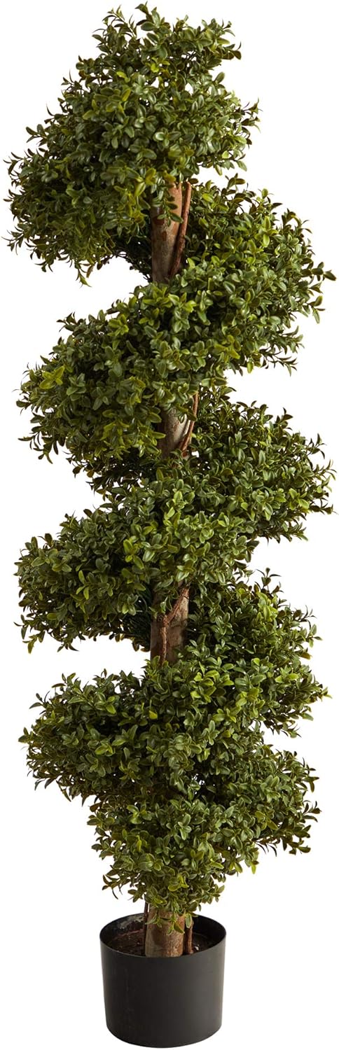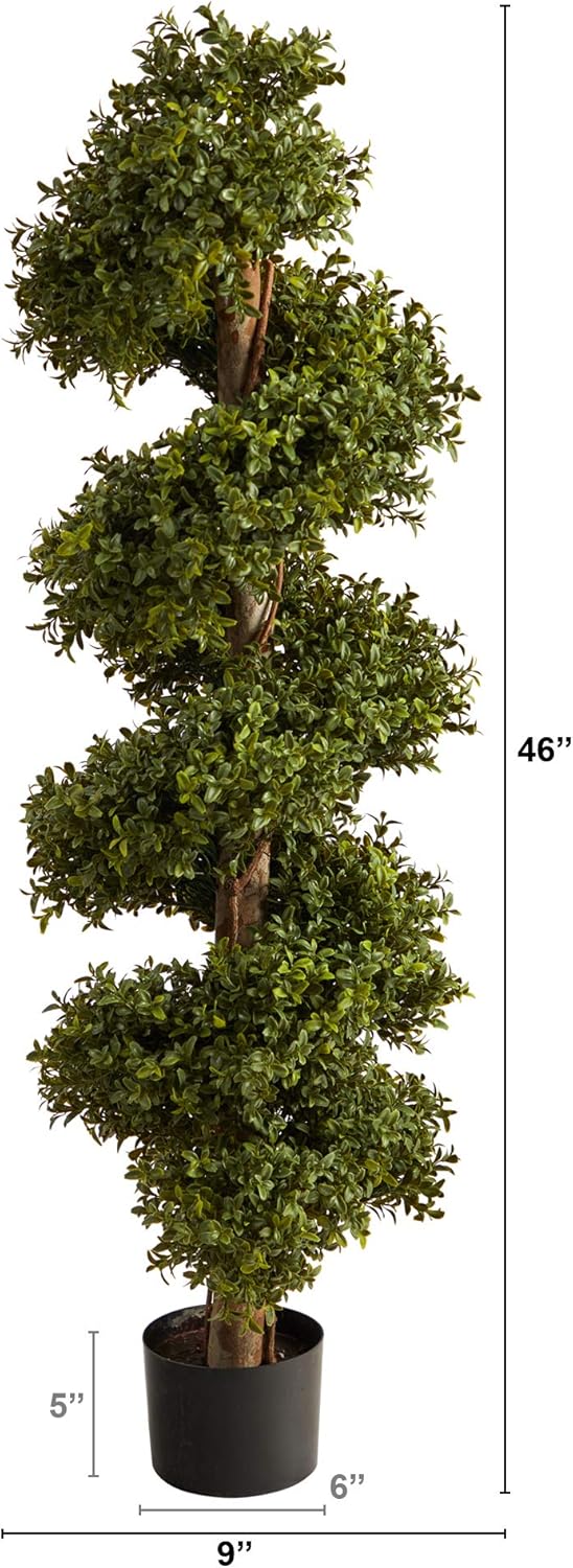 Whirl around this whimsical Artificial Boxwood Topiary Spiral Tree. Exotic to the eye, bring posh, jungle vibes with the twirling greens adorning a trunk like silhouette that delivers a subtle, yet rustic look. Standing 46’ from a black planter (included in height), curate in rooms that need a little green. Perfect for compact spaces like foyers, apartments, or awkward corners. Pair in multiples for cohesion.Silk trees are manufactured using synthetic materials, such as polyester material or plastic, and are well designed and constructed to be life-like in appearance. This item will need to be re-shaped when removed from the secure box to allow it to reach its fullest size. Your artificial plant will look beautiful for years to come; simply wipe clean with a soft dry cloth when needed. About Nearly Natural Inc. - For over 75 years, Nearly Natural Inc. has been providing conscientious consumers with beautiful alternatives to natural decorations. Employing and advised by naturalists who understand the live plant world, Nearly Natural is able to recreate the most realistic-looking decorative items for homes, offices, and businesses. Driven by a true commitment to customer service, attention to detail, and natural philosophy, Nearly Natural strives to bring customers the most beautiful, unique, and striking faux plants and floral on the market. Construction materials: Iron Wire, Plastic