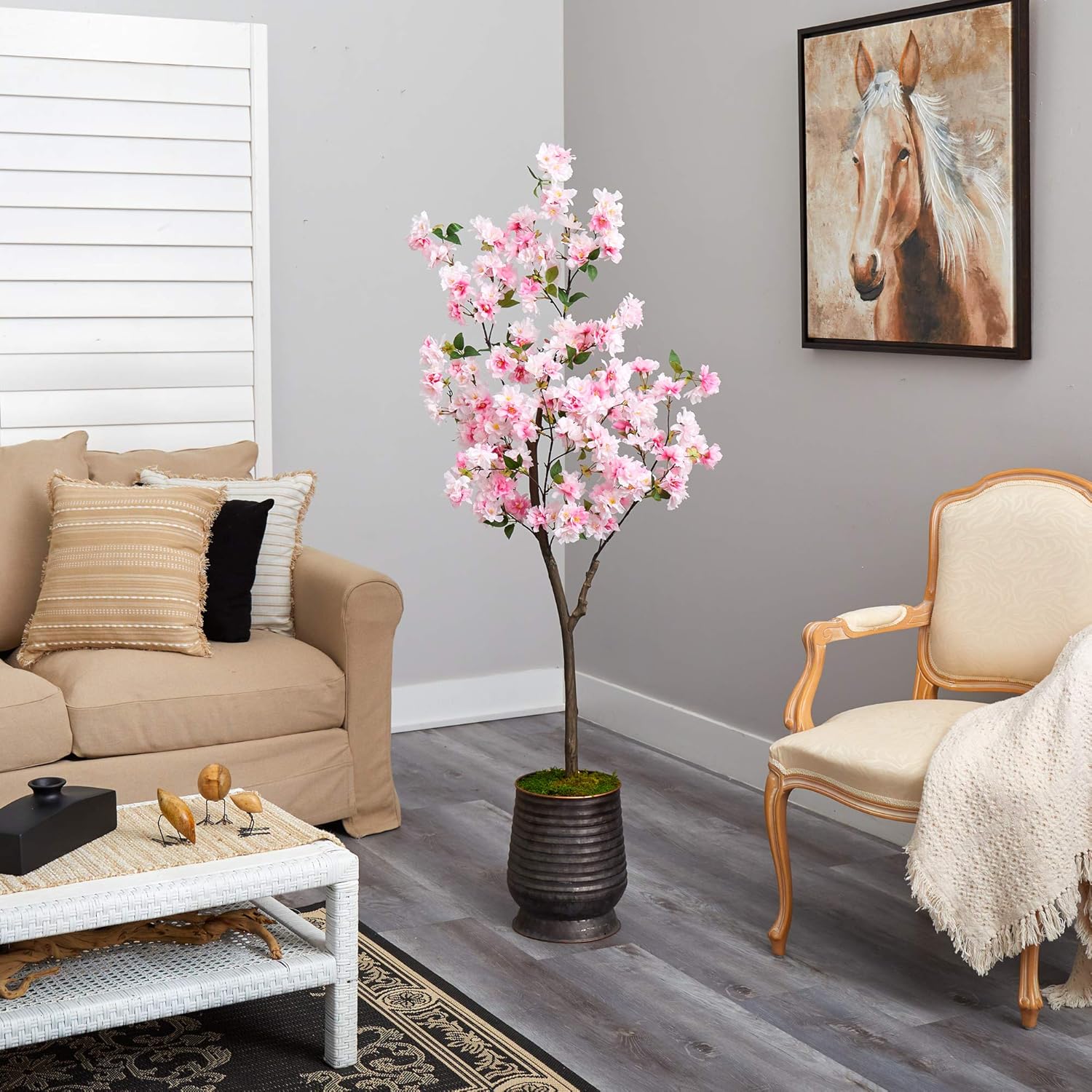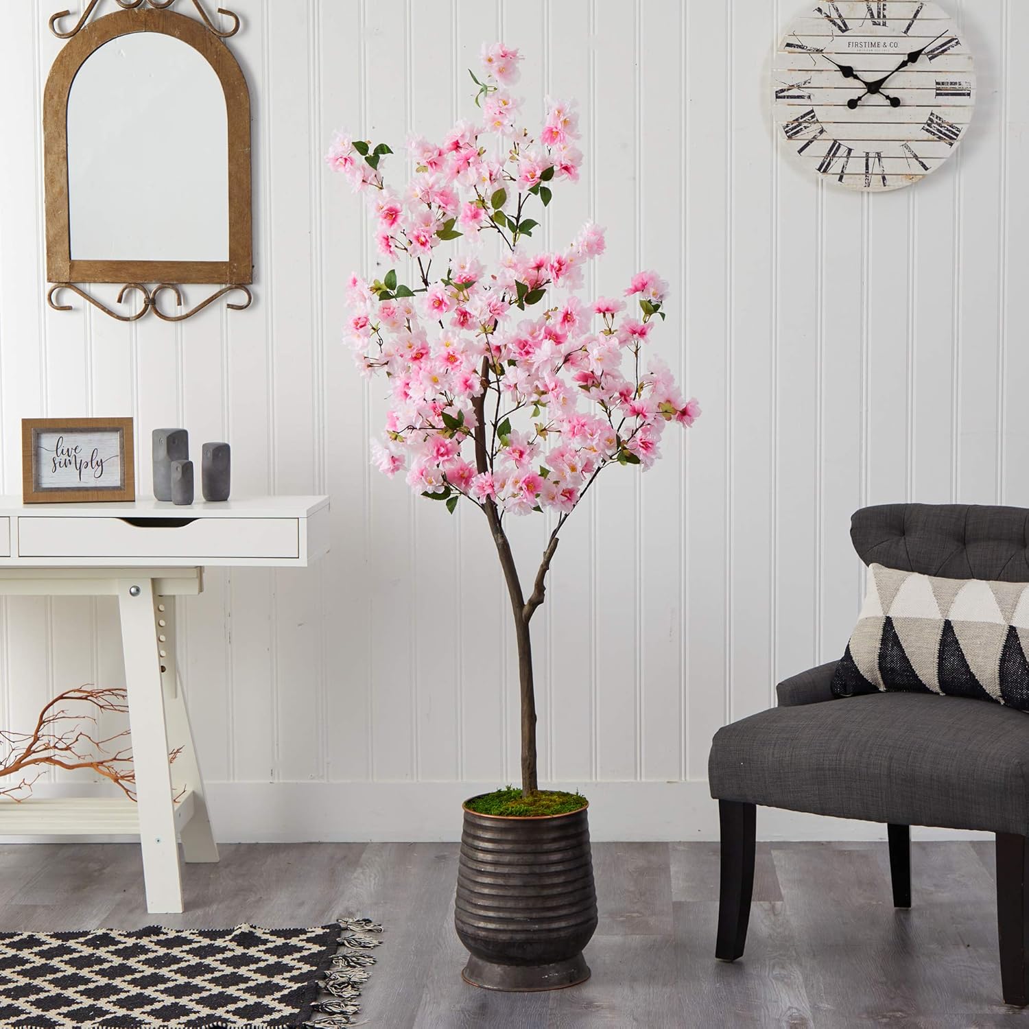 Enjoy the wonders of the majestic spring awakening with this Artificial Cherry Blossom Tree. Incredibly lifelike pink cherry blossom flowers adorn a slim, brown trunk in a rhythmic melody of pink foliage for a full look that will instantly transform your home into the best of Japan. The pink flowers have shades of white and are accented by green leaves for a feminine touch that softens spaces. Standing 5.5' from a ribbed metal planter, curate in tight areas that want to feel pretty in pink. Perfect for bedrooms, bathrooms, awkward corners, or kitchen nooks. Silk trees are manufactured using synthetic materials, such as polyester material or plastic, and are well designed and constructed to be life-like in appearance. This item will need to be re-shaped when removed from the secure box to allow it to reach its fullest size. Your artificial plant will look beautiful for years to come; simply wipe clean with a soft dry cloth when needed.