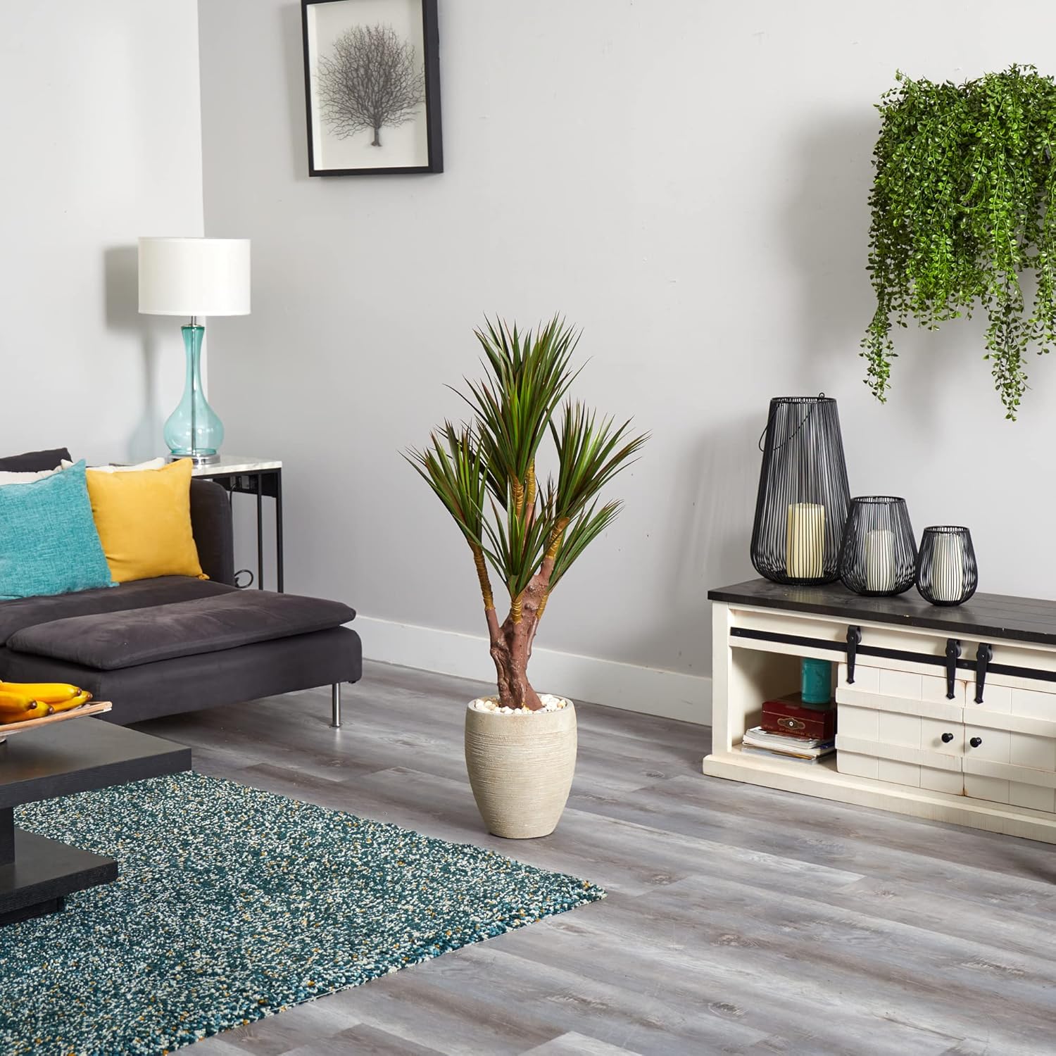 Elevate the greenery in your home environment with the help of this artificial yucca plant consisting of various sharp shoots of lifelike greenery fanning out from a sturdy, textured trunk. Situated in a planter accented with natural tone rocks, this 50” high plant can be placed outside on an outdoor table or porch with out fear of wilt or discoloration.