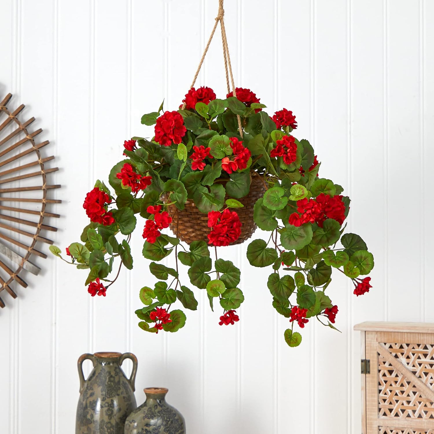 Spruce up your home or office space with these vibrant colored geraniums. Bold yet delicately crafted petals rest peacefully among a bed of rich leaves, with both large and small blooms adorning this expertly designed masterpiece. Between the lush, soft petals and the authentic colored leaves, you’ll find yourself reaching for the watering can. A tasteful wicker planter filled with artificial soil adds to the natural appeal of this gorgeous geranium silk hanging basket. Silk arrangements are manufactured using synthetic materials, such as polyester material or plastic, and are well designed and constructed to be life-like in appearance. This item may need to be re-shaped when removed from the secure box to allow it to reach its fullest size. Your plant will look beautiful for years to come; simply wipe clean with a soft dry cloth when needed.