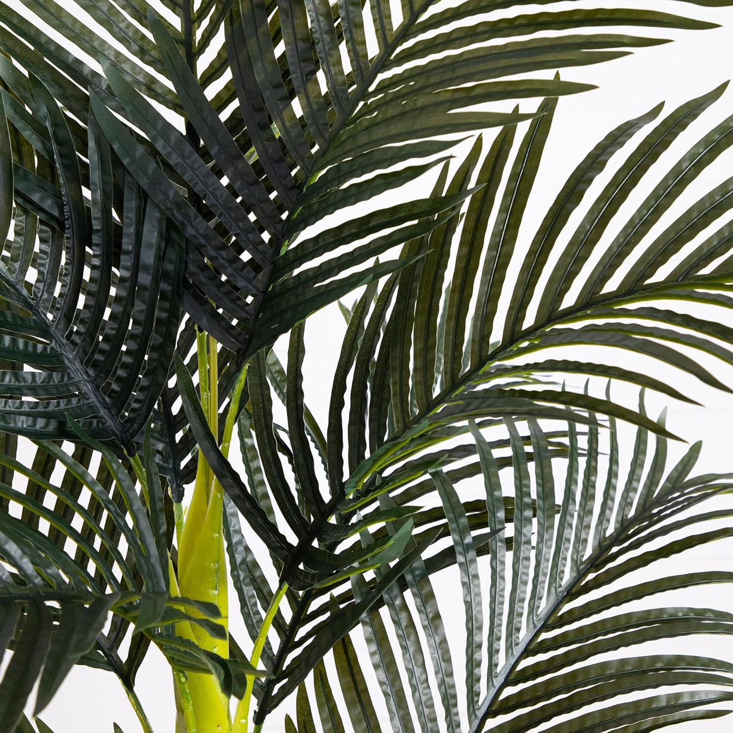 Elevate your indoor decor with the 6ft Artificial Double Stalk Golden Cane Palm Tree, a masterpiece designed to bring the lush vibrancy of the tropics right into your living space. This artificial tree is expertly crafted to mimic the natural beauty of the golden cane palm, featuring two robust trunks and lush, detailed fronds that radiate a lifelike charm. Each leaf boasts a gradient of green, enhancing the tree's realistic appearance and making it a perfect addition to any room needing a touch of greenery. The flexibility of the branches allows you to personalize the tree’s shape to suit your space and style preferences. Whether it's setting a relaxing ambiance in your living room or adding a touch of nature to your office, this faux palm tree adapts beautifully. It comes housed in a simple nursery planter, ready to be placed in a decorative pot of your choice for a more customized and seamless integration into your decor. Ideal for high-ceiling rooms, this artificial palm tree is recommended for indoor use, ensuring durability and maintaining its pristine appearance without the need for water or sunlight. Transform your home into a serene retreat with this stunning, maintenance-free artificial tree.