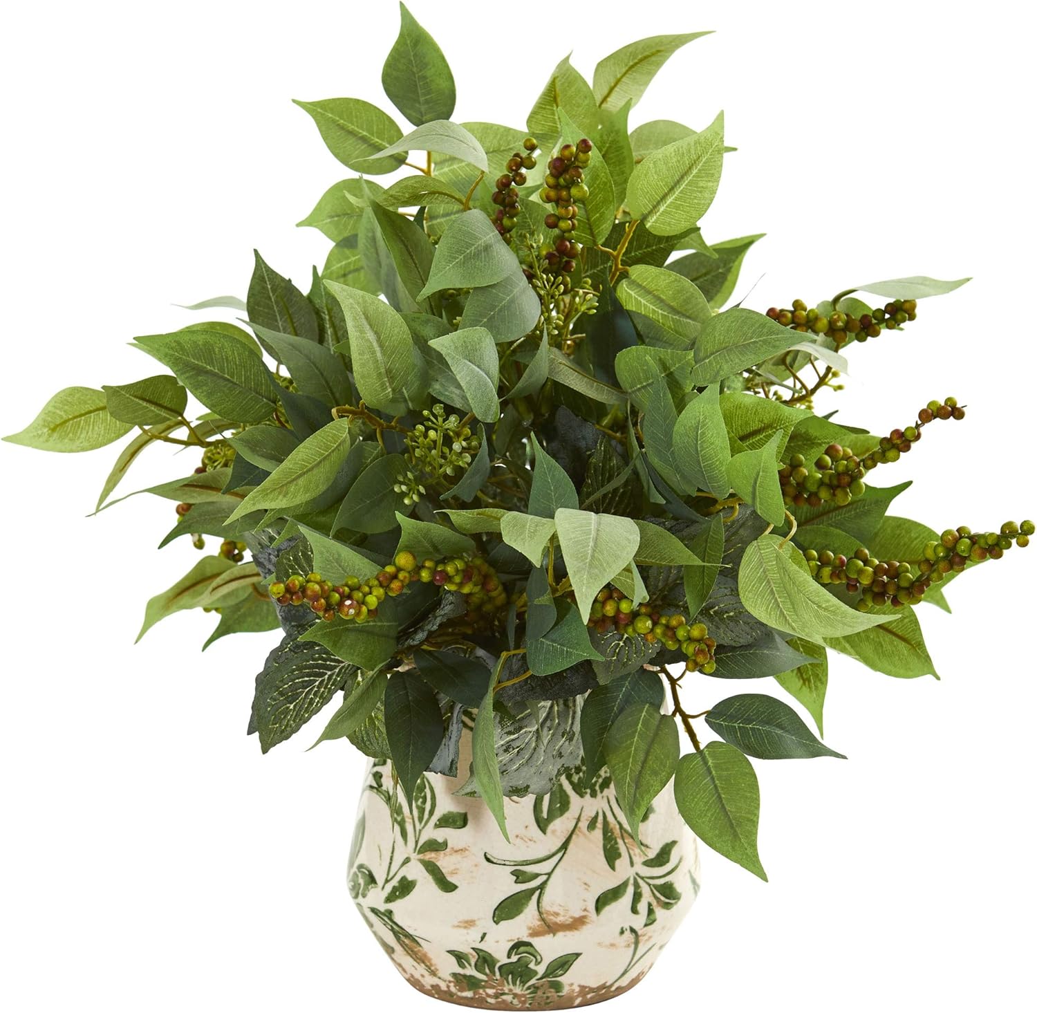 Mixed Ficus, Fittonia and Berries Artificial Plant in Floral Vase