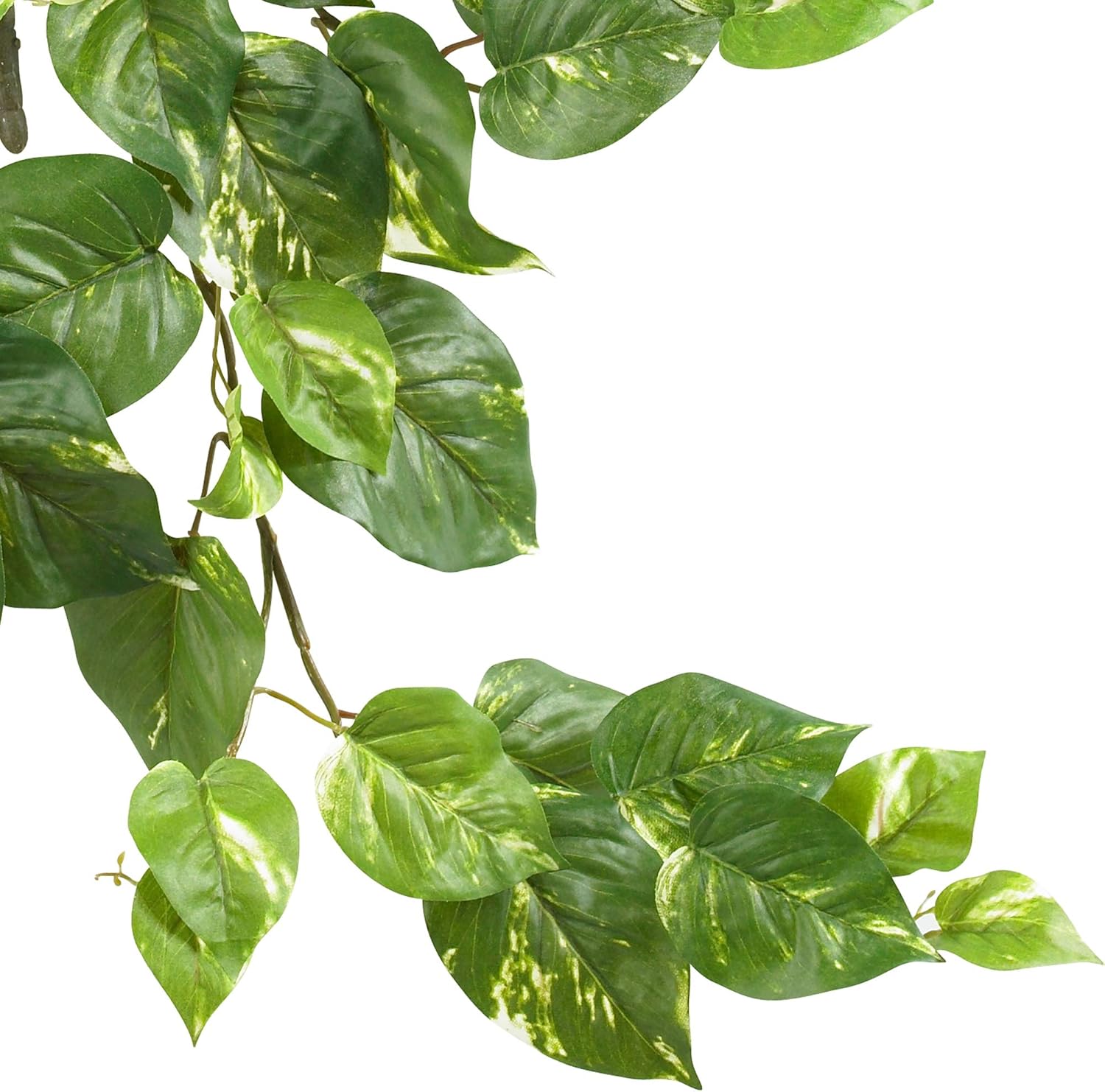 The Pothos hanging bush dramatically displays its pointed heart-shaped variegated foliage. Each leaf displays vibrant shades of green that drape down to create a lengthy display. Hang up high to show off it's robust foliage in a bathroom, office, or kitchen.