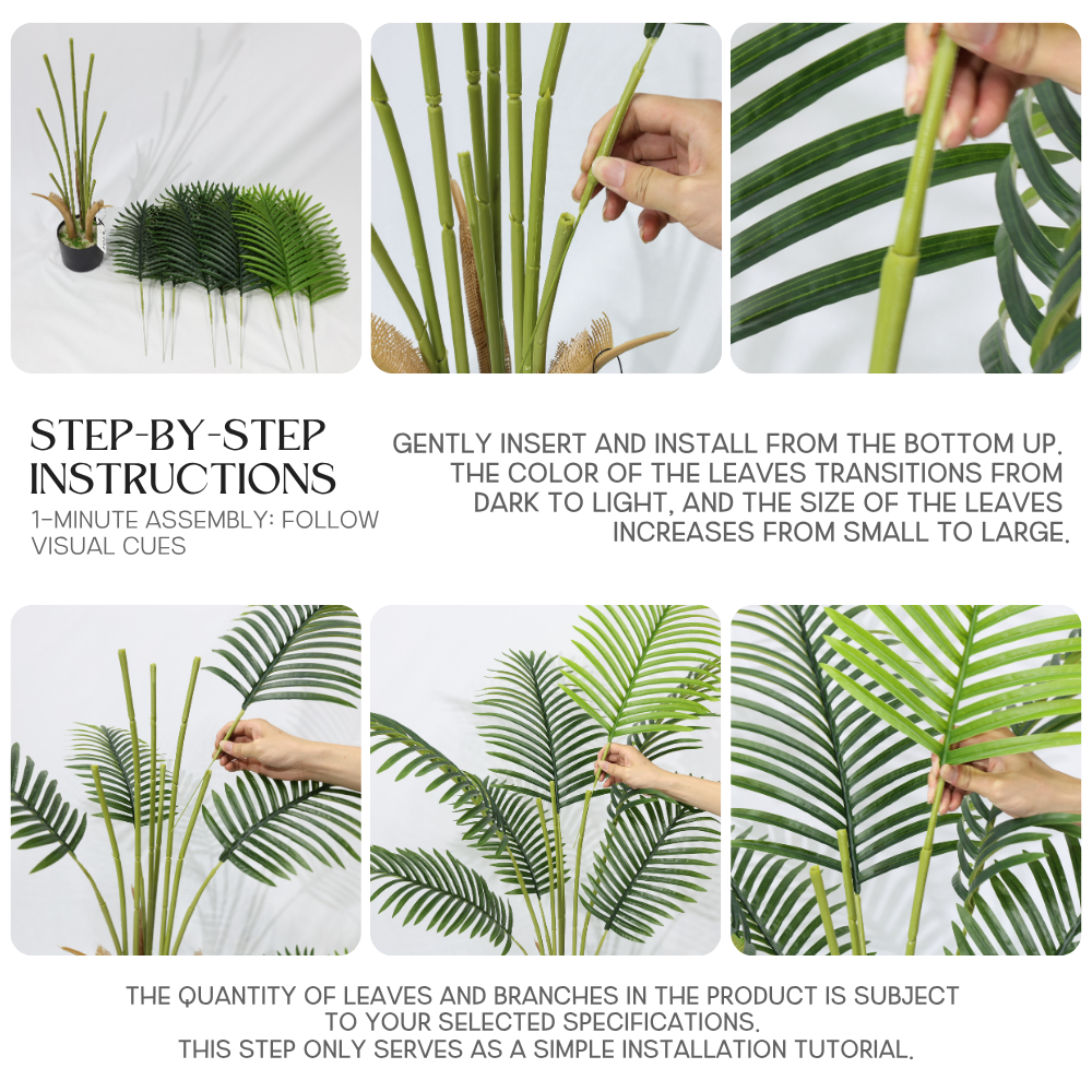 Nota: smuovere delicatamente le foglie dopo averle disimballate per ripristinarne la pienezza; dopo il semplice assemblaggio, posizionarle direttamente in vasi o come decorazione da pavimento.