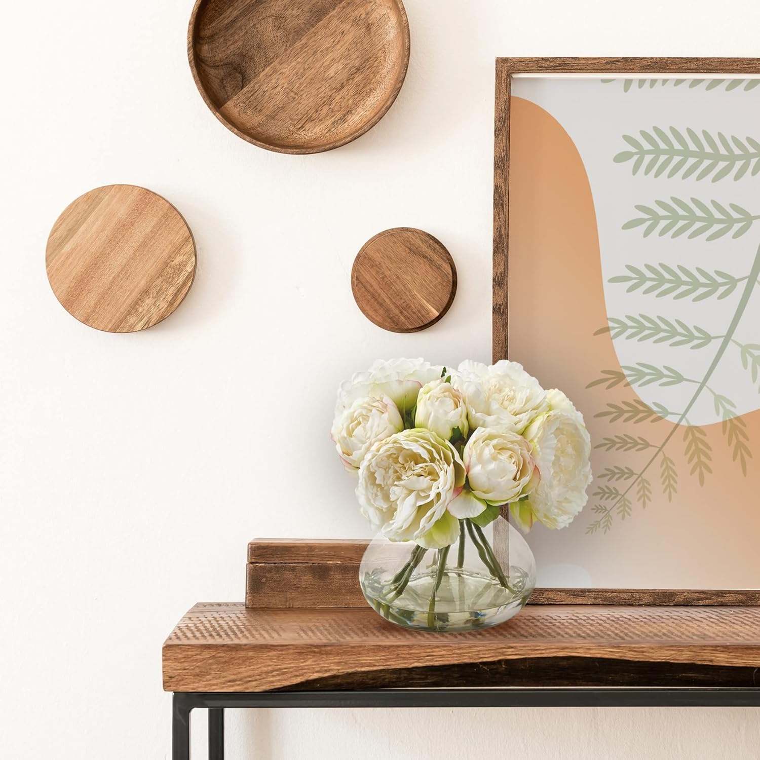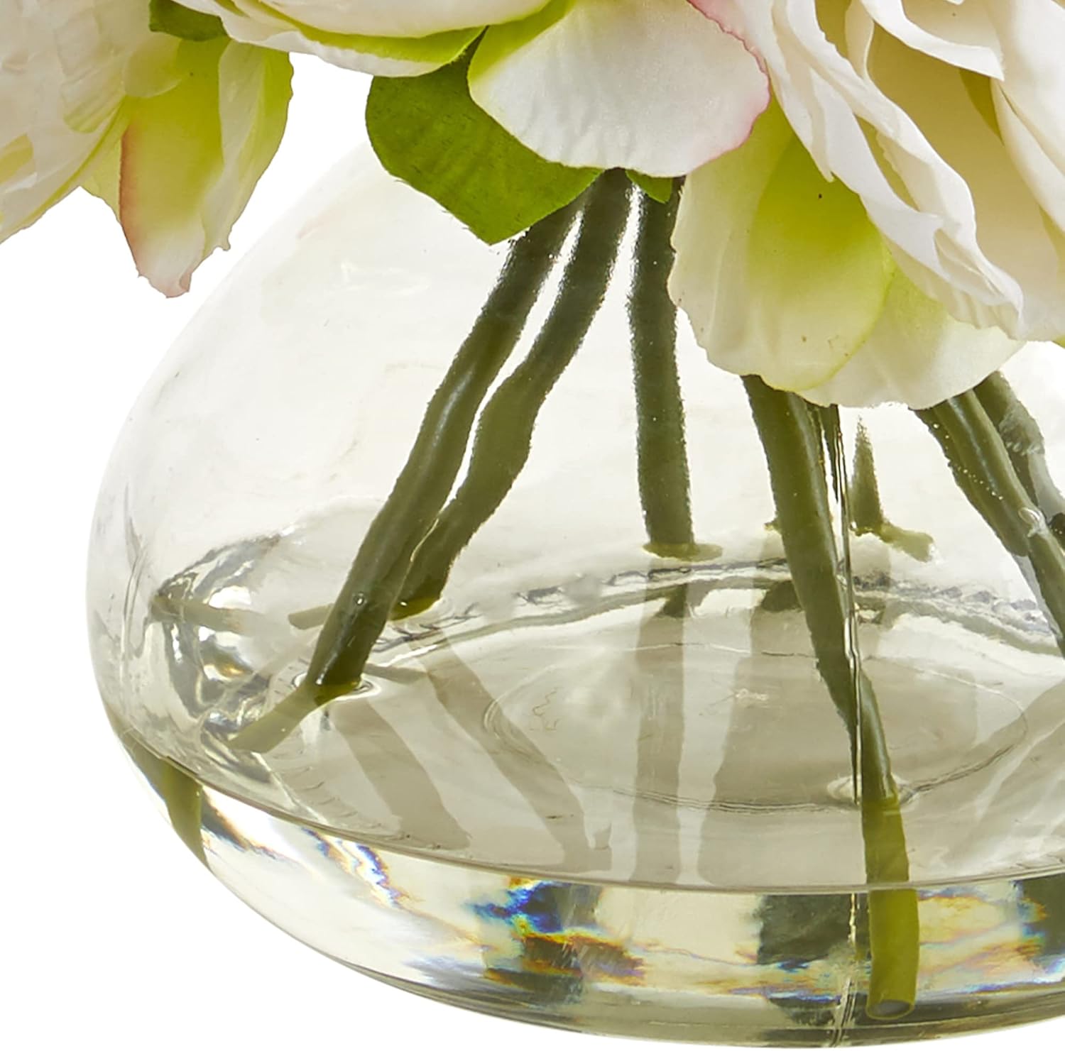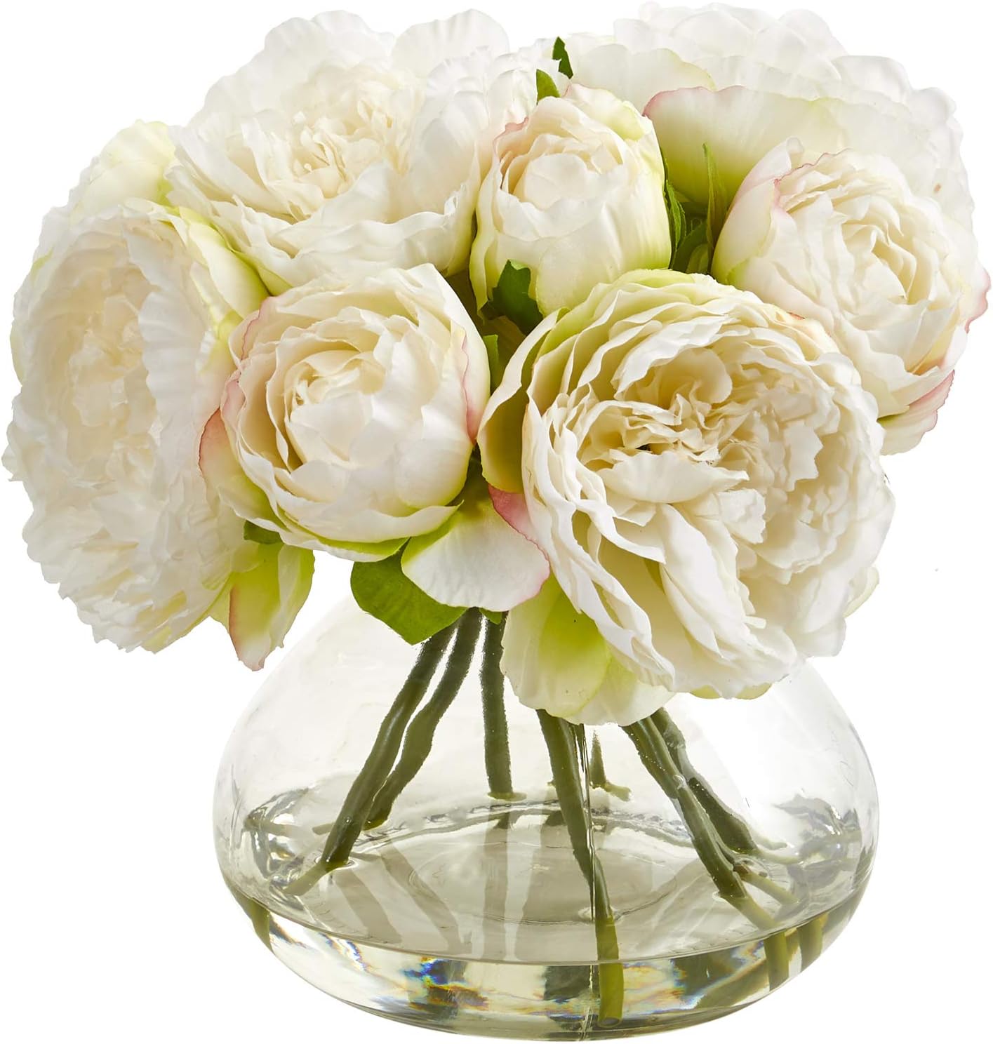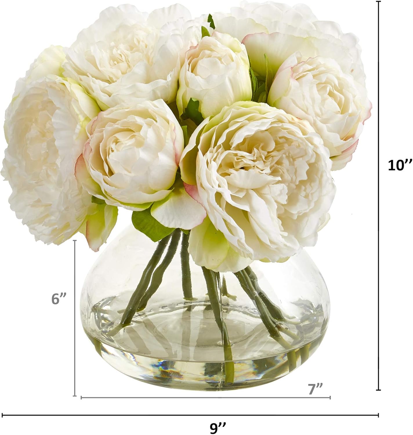 Add hints of femininity to your home interiors with this gorgeous arrangement of artificial peonies showcasing realistic, flowering blooms beautifully displayed in a glass vase. Reaching 10” tall, this elegant arrangement would complement a modern bedroom or guest room.