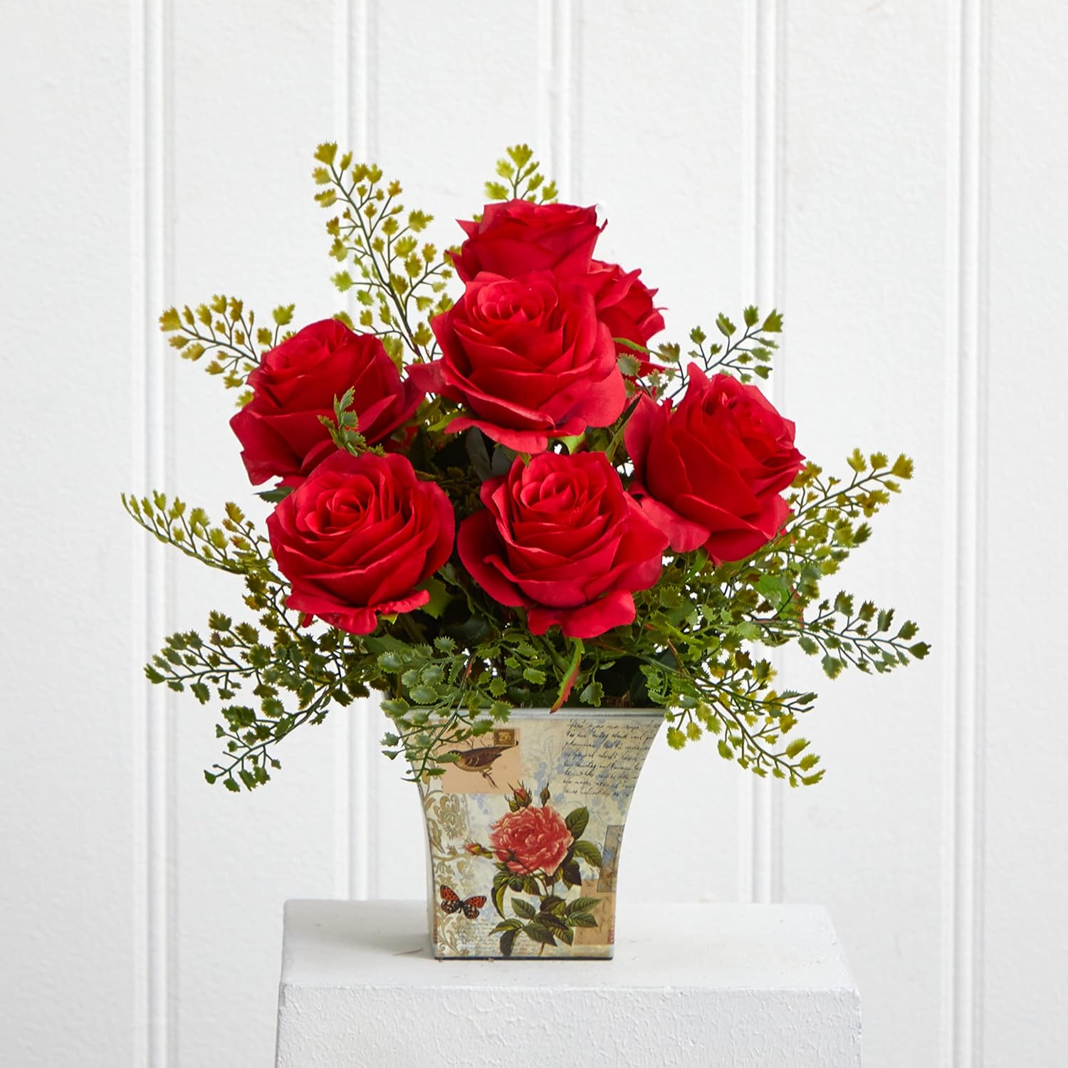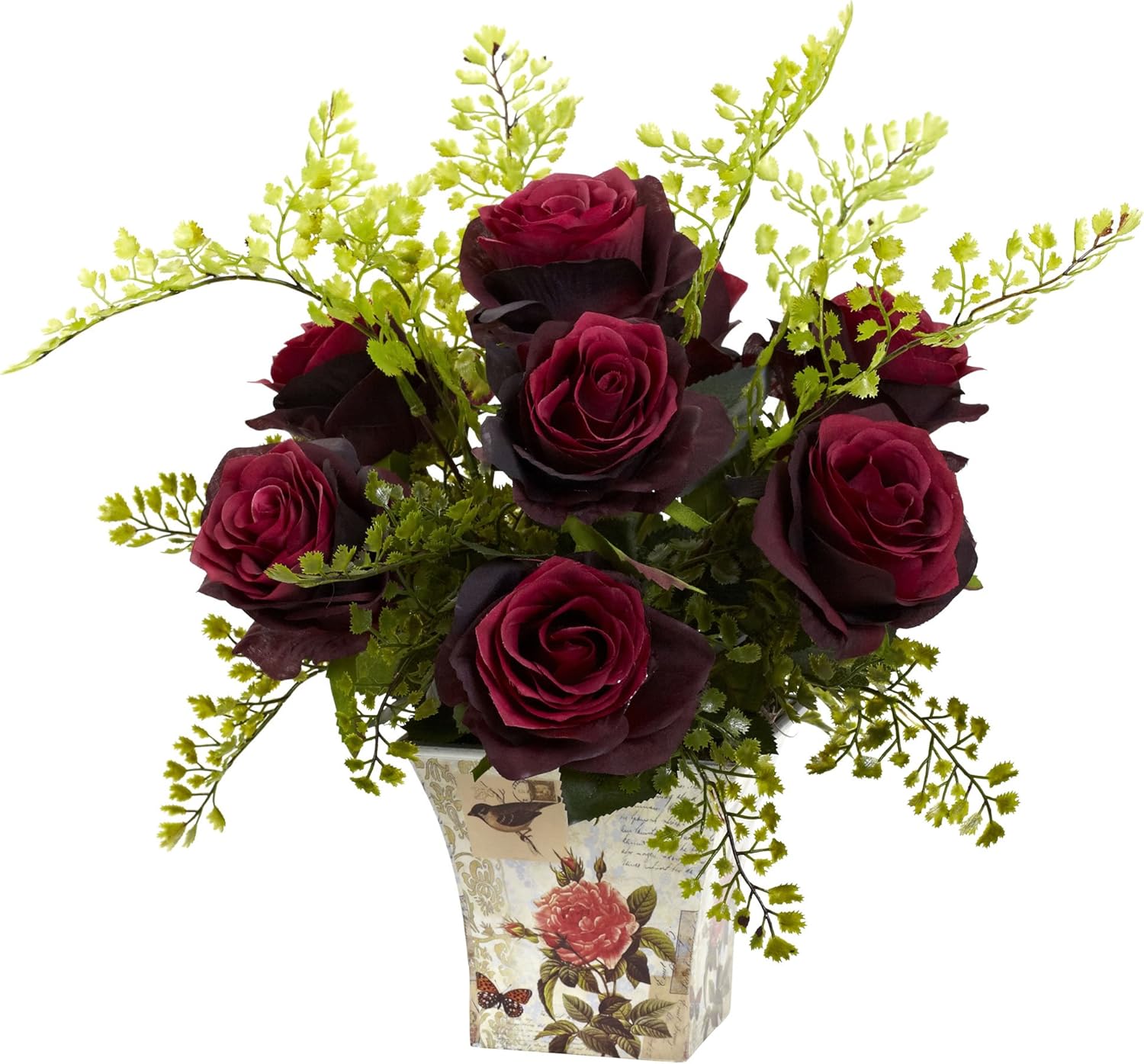 A perfect combination of textures, this Rose and Maiden Hair arrangement combines the natural beauty of full rose blooms with the wispy delightfulness of maiden hair. Then to top it off, we place this pairing in a charmingly decorated floral planter. This piece is perfect for home or office.
