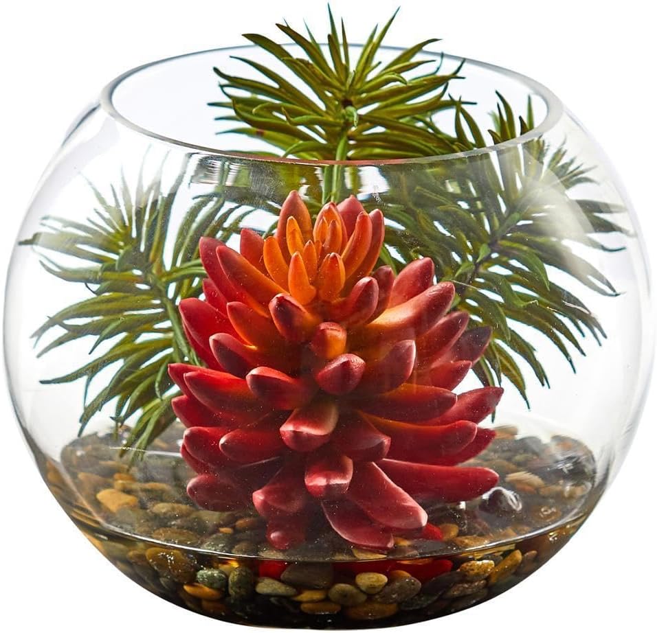 The 6-inch succulent artificial plant features a stunning mixture of dark and green thick succulent leaves. The arrangement is contained in a clear round vase that is small enough to fit on any surface with limited space. You can place it on a mantelpiece or wall-mounted shelf next to a series of plant terrariums to create a southwestern styled indoor garden in your home.