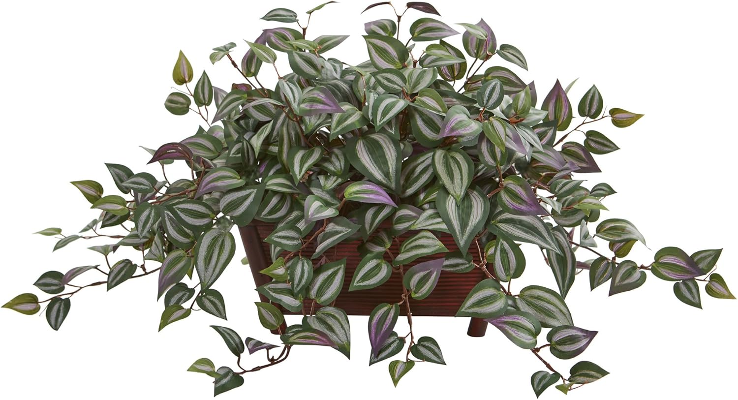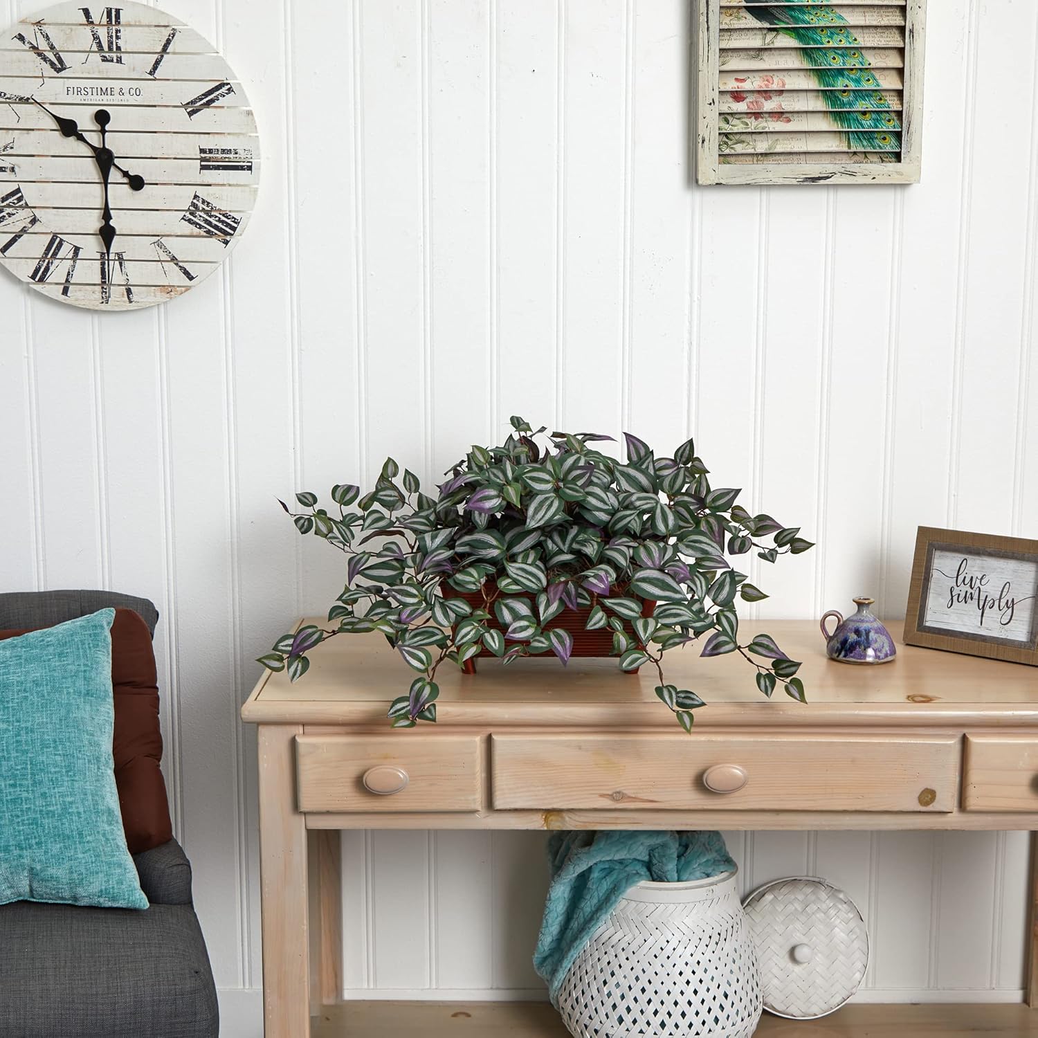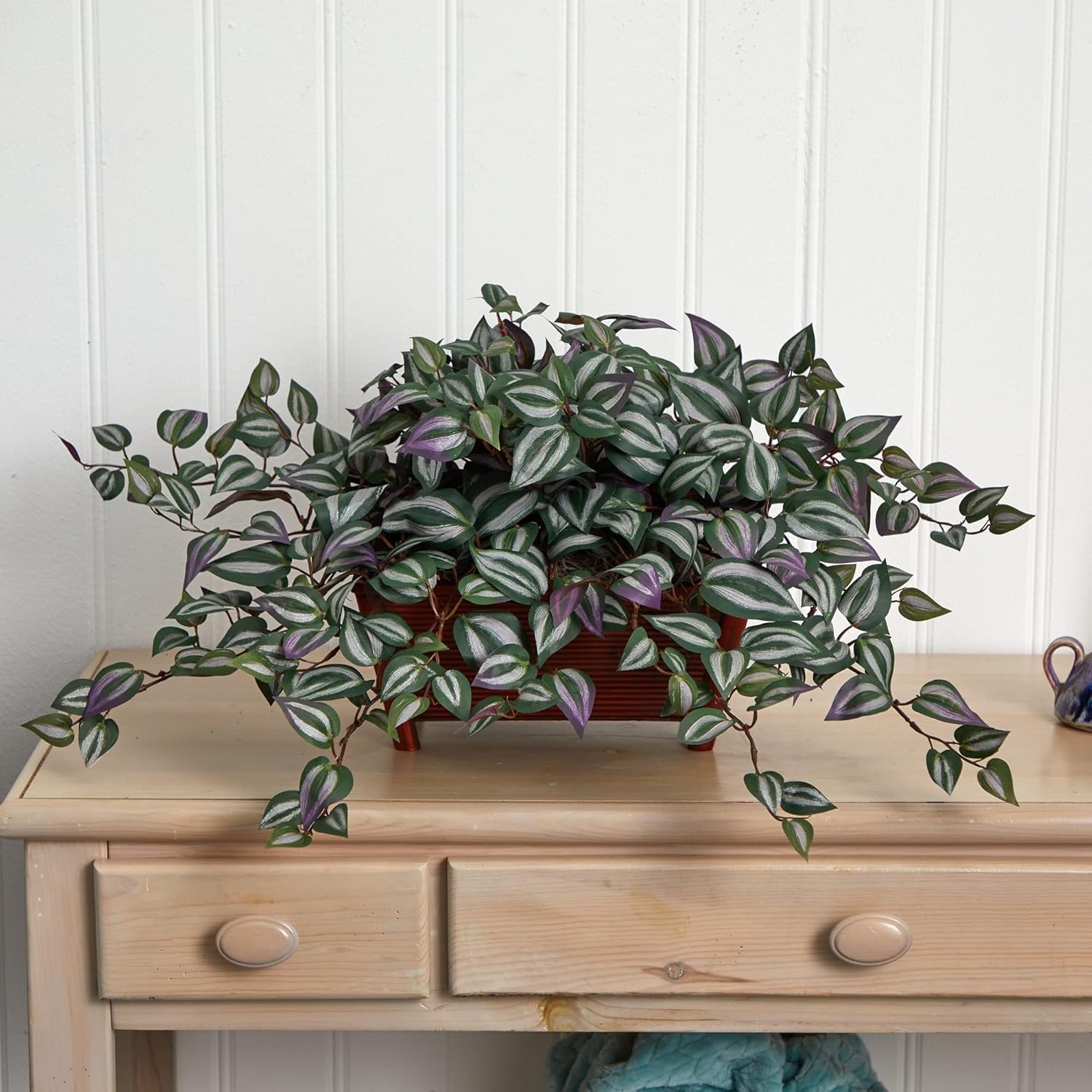 Engulfing the included planter, the lush, variegated leaves with various hues give a lifelike appearance to this Wandering Jew artificial plant. At only 14 inches, you can place this Wandering Jew artificial plant nearly anywhere to brighten up your home or office. Pair it with a large wicker basket filled with blankets and place them on either side of your fireplace for a contrasting look.